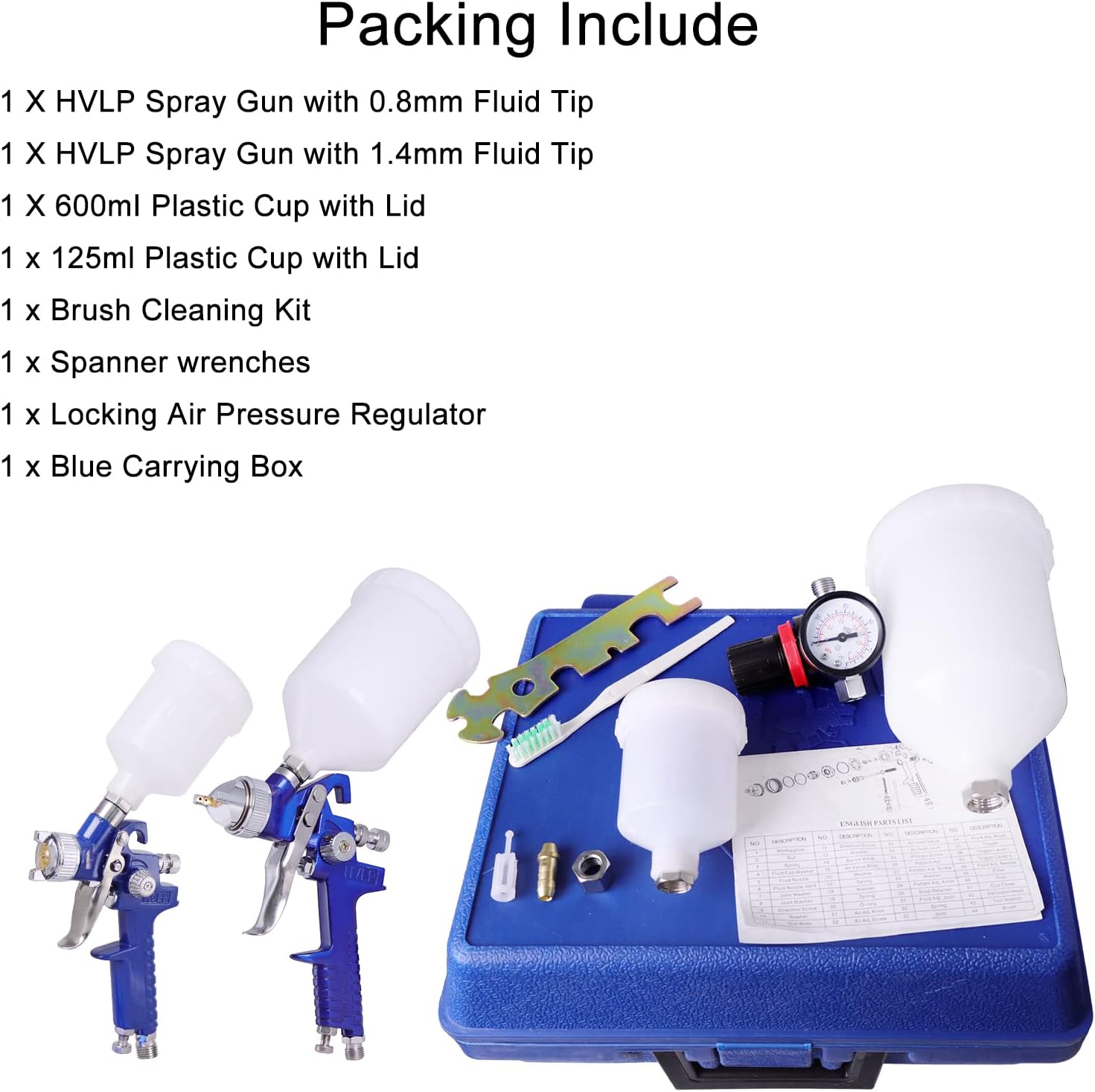 1 x manomètre2 x gobelets en plastique ABS1 x pinceau1 x séparateur huile-eau1 x petit pistolet environnemental (grand)1 x petit pistolet environnemental1 x pistolet de pulvérisation environnementale à basse pression