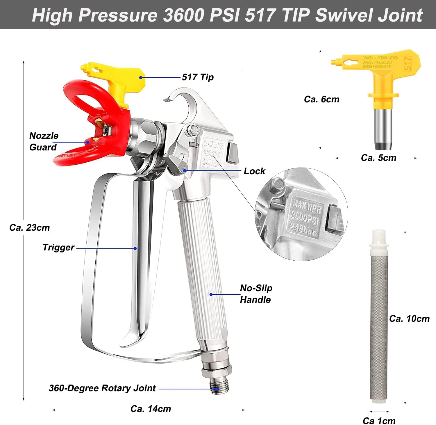 【Facile à utiliser et à nettoyer】 Avec embout 517 et protège-buse. Notre pistolet à peinture sans air est à haute pression, à forte brumisation, pulvérise finement et en douceur, économise de la peinture, convient à la plupart des pulvérisateurs de peinture sans air. Le filtre de couleur remplaçable dans la poignée réduit le colmatage de la pointe et améliore la finition.