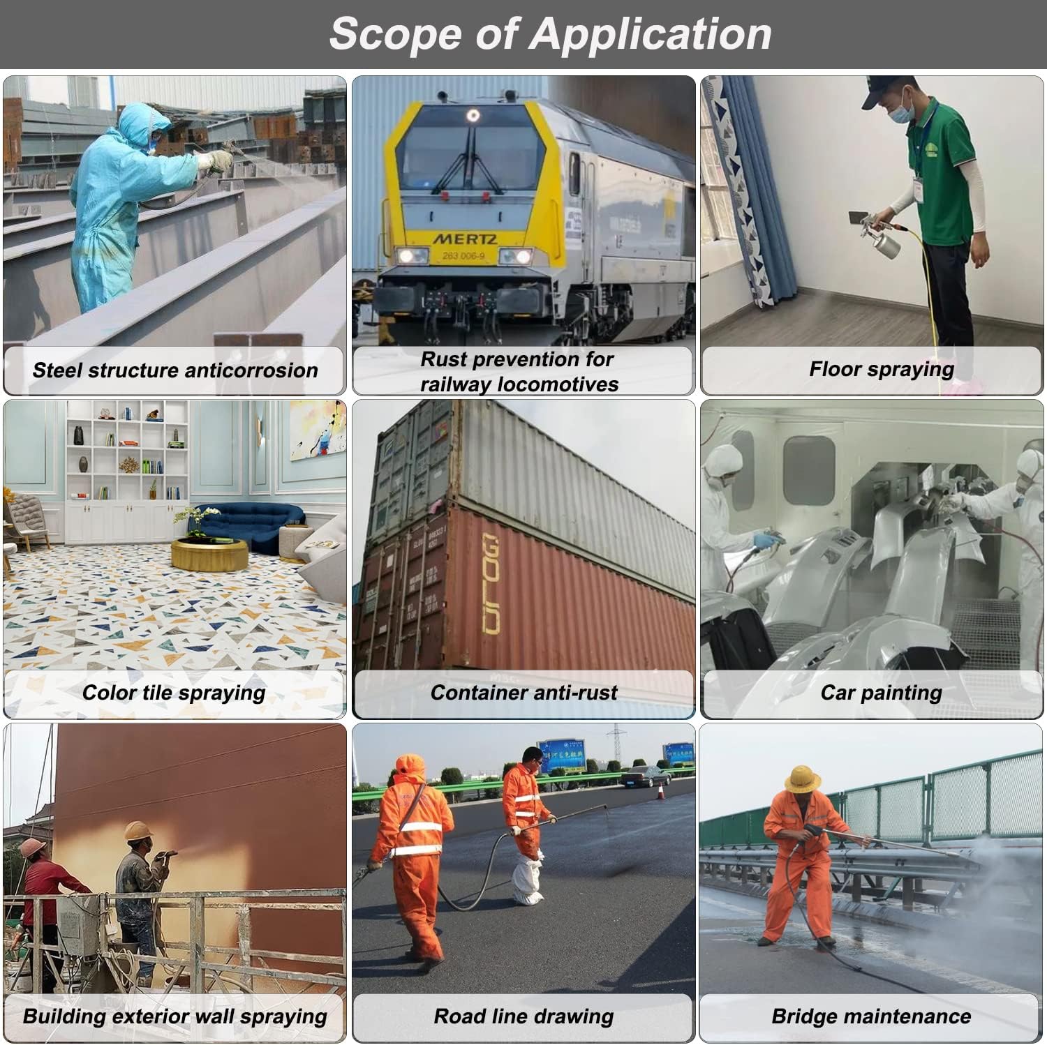 【Large application】 Convient pour la construction de décoration intérieure, l’industrie du carrelage, l’eau, la construction de peinture à l’huile, la surface en acier. Conçu de manière experte pour manipuler facilement une large gamme de matériaux. Par exemple, les peintures au latex, les peintures, les revêtements pour les navires, les ponts, les tours, les colonnes et autres grandes structures métalliques à long terme et l’industrie du bâtiment.