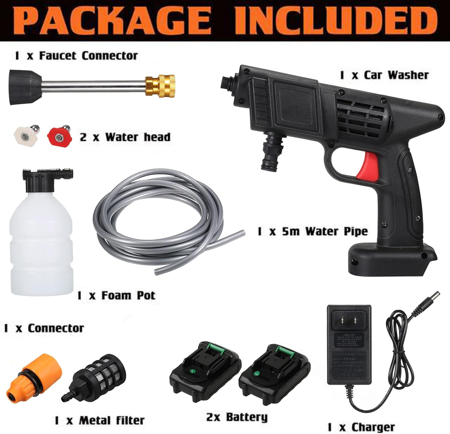 Spécification:La couleur noirePrise :UEMatériau de la rondelle : CuivreMatériau de la poignée: matériaux d’ingénierieTension d’entrée : 24 VPression de sortie : 3,5 bars/50 psi.Puissance : 550 WBatterie : 1500mAhDébit d’eau : 4 L/MinTension du chargeur : AC 100-240V 50/60HzLongueur du tuyau d’eau : 5 mètresTaille du produit : 24 * 24 * 14 cmPoids du colis : 1500g Liste de colisage:1 * lave-auto1 * connecteur de robinet2 * tête d’eau1 * pot en mousse1 * connecteur1 * filtre en métalConduite d’eau 1 * 5M2 * Batterie1 * chargeur