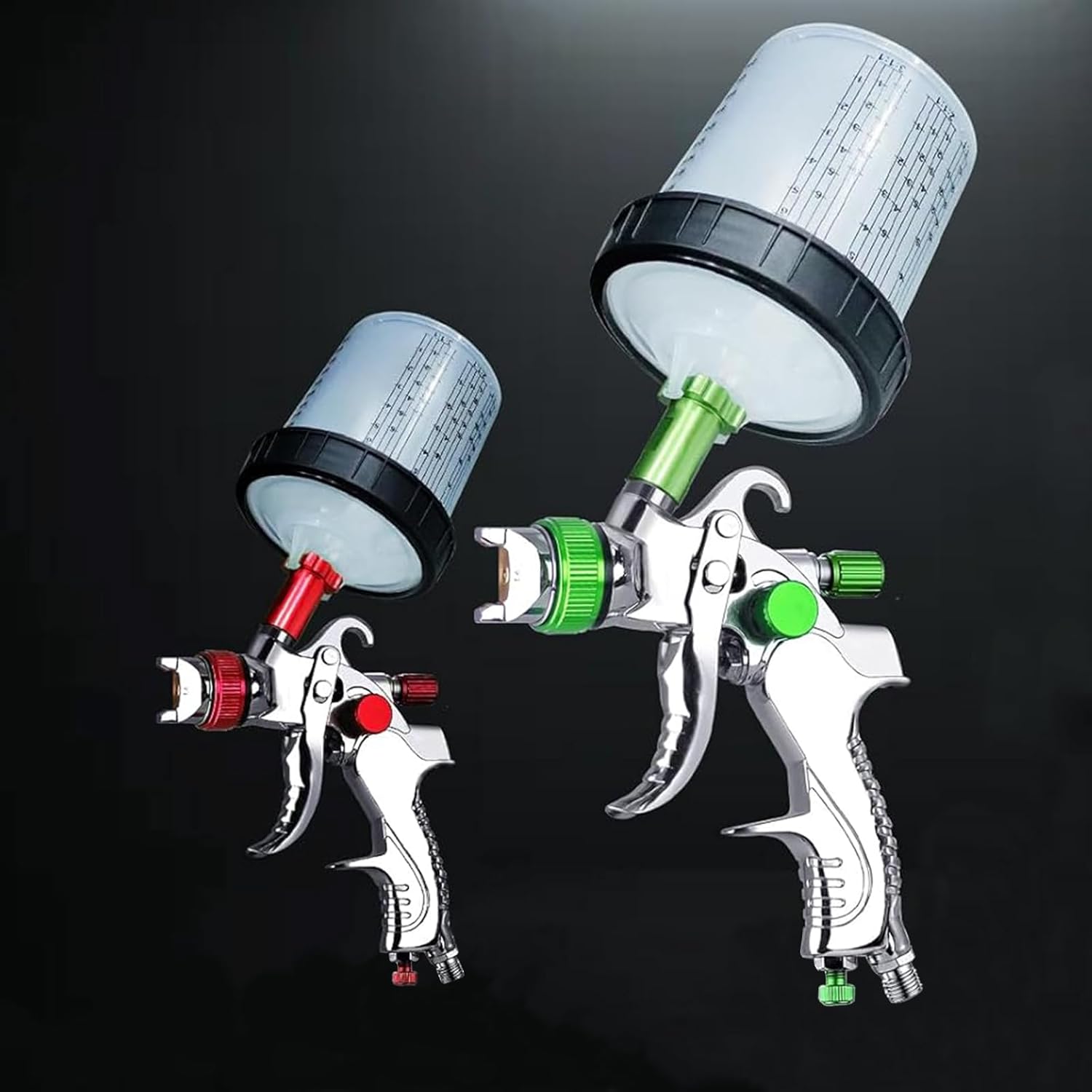 Taille de la buse: 1.4MM&1.7MM&2.0MMCouleur: Vert & rouge Material: Métal & plastiquePression recommandée: 15CFM Capacité de peinture: 600ml Gobelet de mélange rapide: 1pc 600ML