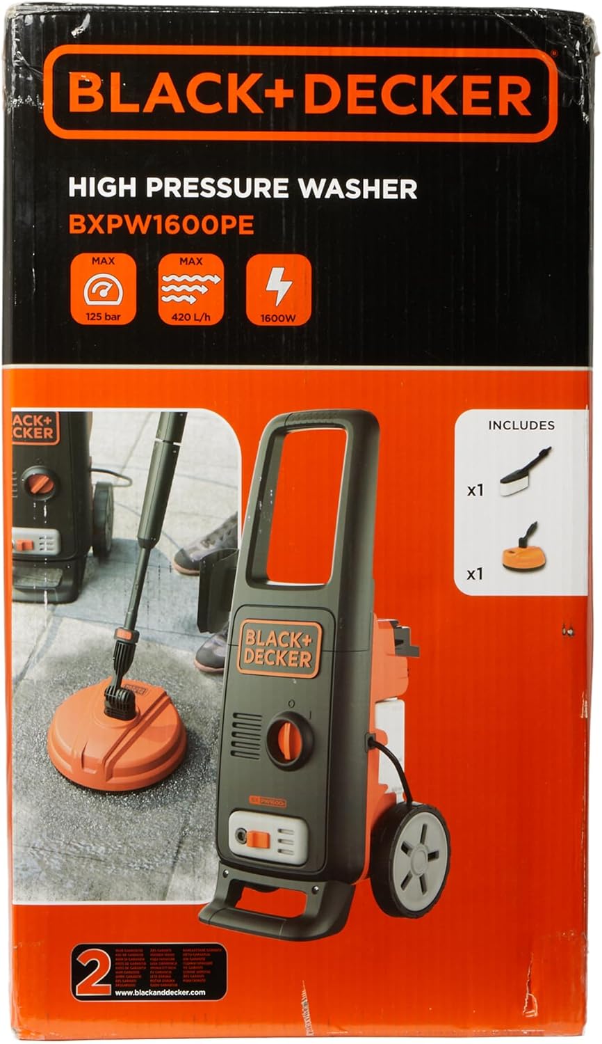 BXPW1600PE est un nettoyeur pratique et moderne pour enlever facilement la saleté tenace sur les surfaces domestiques de taille moyenne, comme les sols et murs extérieurs. Il est également l’outil parfait pour laver les grilles, les bancs, les meubles et outils de jardin, les vélos, les motos, les voitures, les escaliers et les piscines. Sa poignée intégrée sur le haut et ses deux roulettes de 16 cm de diamètre simplifient le transport. Le nettoyeur est maniable et léger. Après emploi, tous les accessoires peuvent être rangés sur les supports prévus à cet effet à l’arrière du nettoyeur, pour tout garder en ordre et pour occuper moins de place. Son utilisation est simple comme bonjour ! Il suffit de le raccorder à un robinet et à la prise de courant, puis de l’allumer en appuyant sur l’interrupteur. Les accessoires inclus sont : pistolet, lance et flexible haute pression de 6 mètres, une rotabuse qui augmente la puissance du jet d’eau et la surface de nettoyage pour éliminer la saleté la plus tenace, une buse à jet réglable qui permet de varier le jet de cylindrique à éventail pour exercer un lavage plus délicat, un kit canon à mousse de 0,4 litre à monter sur la lance, une brosse fixe qui optimise l’efficacité du lavage par rapport à la simple lance, et le Patio Cleaner pour nettoyer plus en profondeur les sols, les balcons et les vérandas en bois. La durée de la garantie est de 2 ans à compter de la date d’achat.