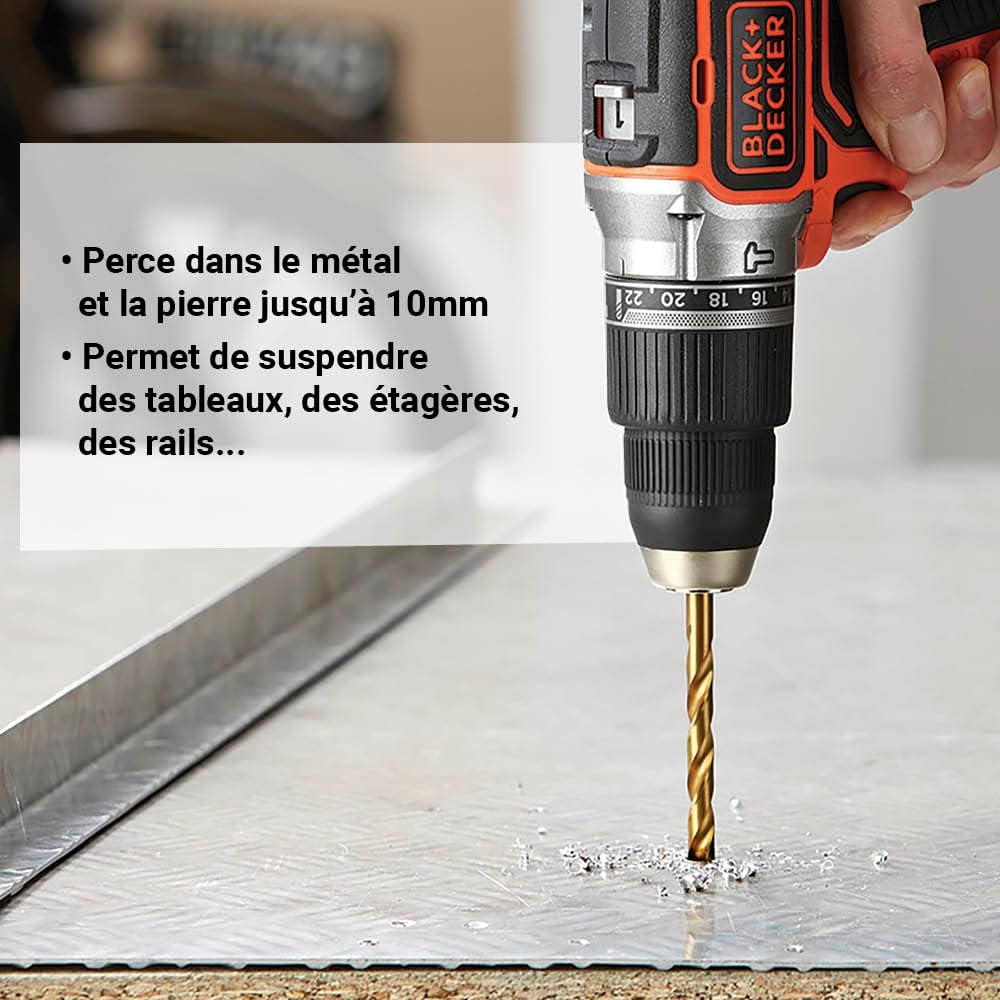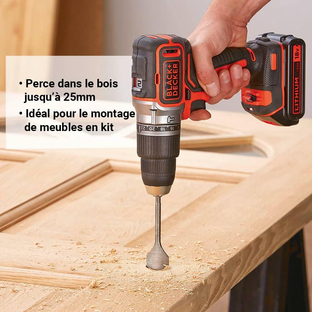 Perceuse à percussion Brushless sans fil Black+Decker de 18V et 2, 5Ah. La perceuse vous permettra d’atteindre un couple maximal de 52Nm pour percer dans les matériaux durs comme le béton, le tout avec une vitesse variable pouvant alle jusqu’à 1650 tours/minute. La cadence de frappe de cette perceuse est de 28050 coups/minute. Cette perceuse est livrée avec 2 batteries et un chargeur.