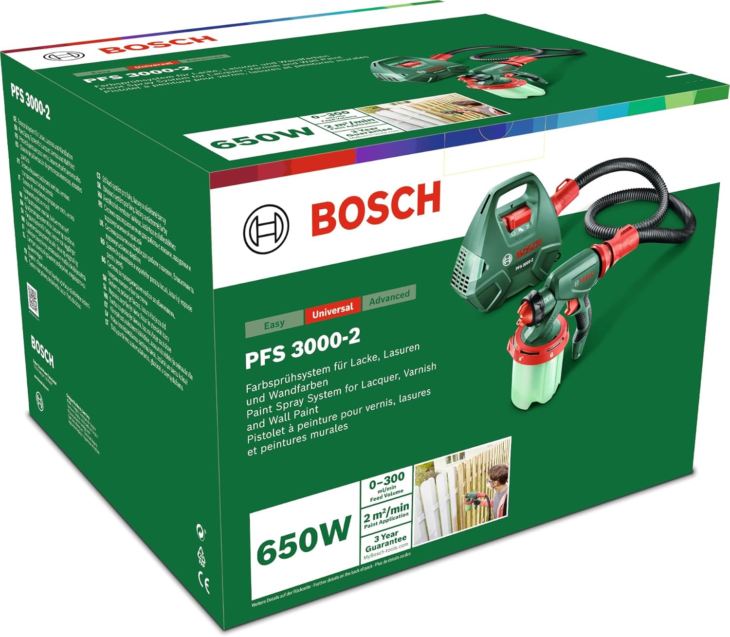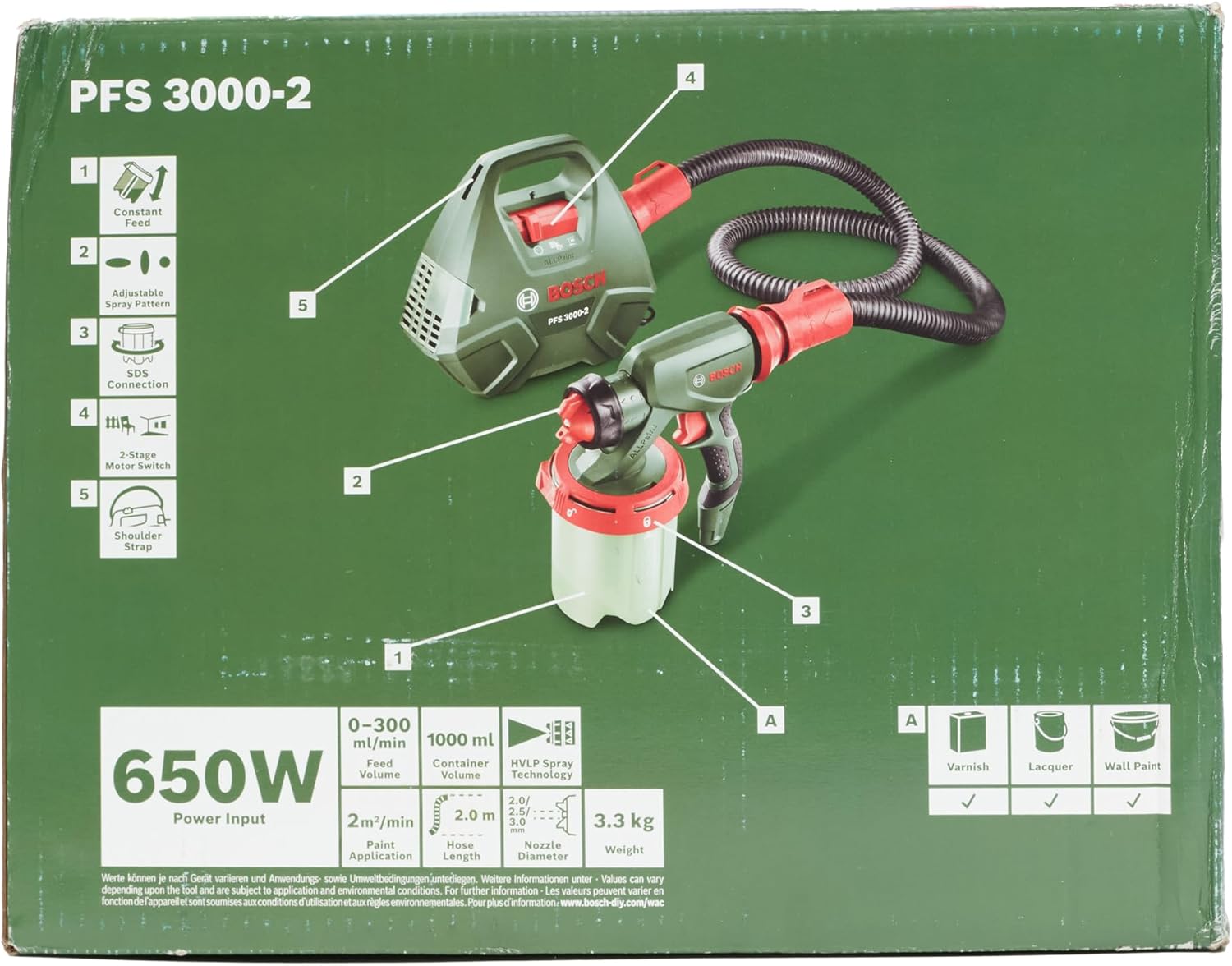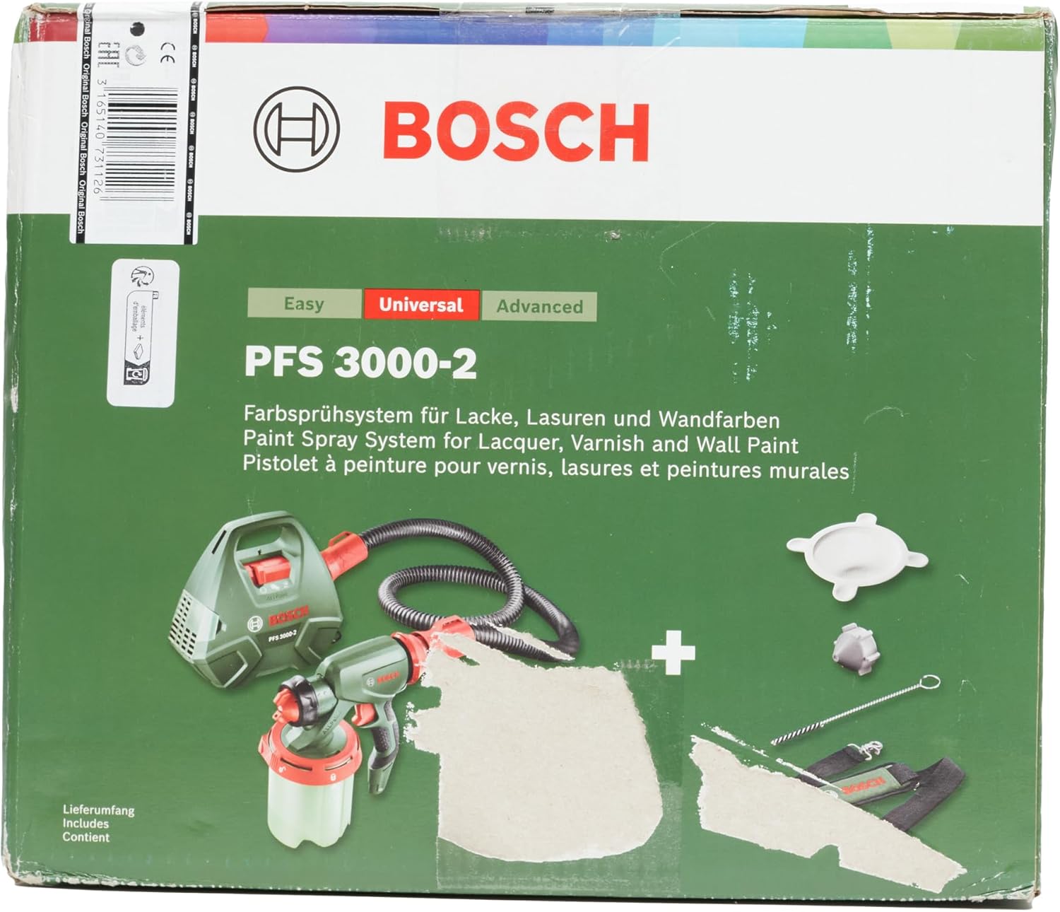Livré dans un carton avec 1 PFS 3000-2, 1 buse pour vernis, laques et lasures (grise), 1 buse pré-montée pour peinture murale (blanche), 1 brosse de nettoyage, 1 filtre à peinture, 1 godet de 1000 ml avec couvercle et 1 sacoche et ceinture »