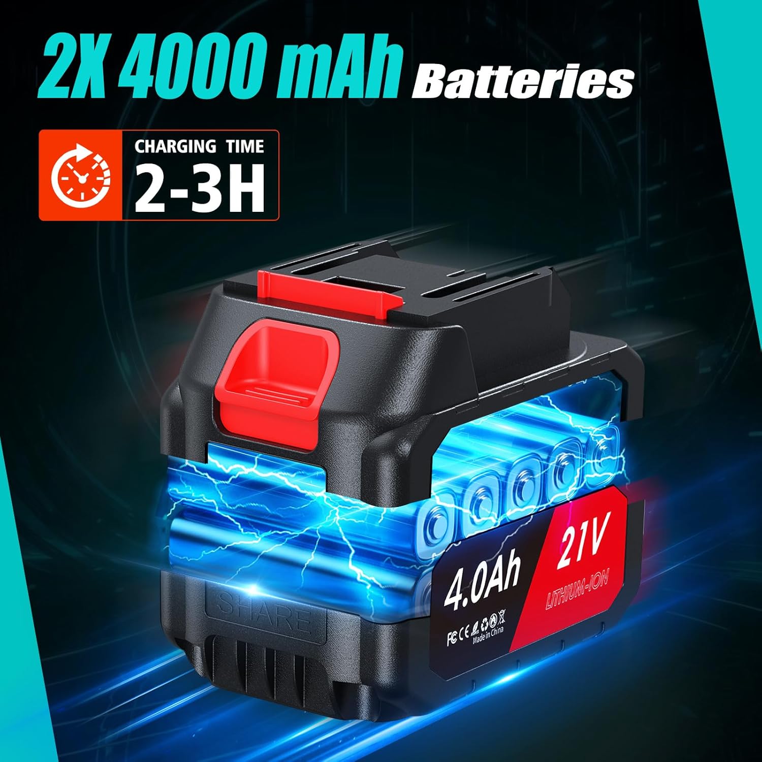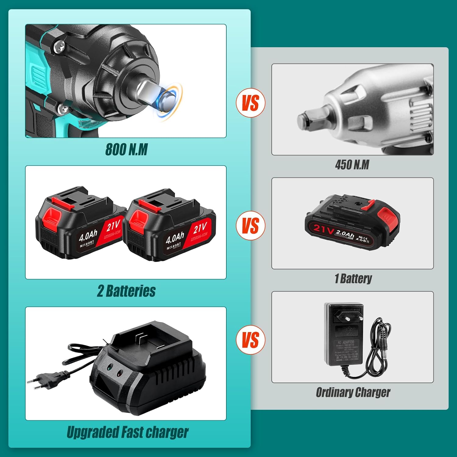 【Two 4,0 Ah Batteries and 4 Tough Sockets】Equipped with two high-capacity 4,0ah lithium batteries, which is 100% or even more than traditional personal rechargeable impact wrench. Les deux batteries peuvent être utilisées en alternance.Les 4 douilles en acier trempé sont les 4 tailles courantes, ce qui vous permettra de répondre à la plupart des travaux. Le matériau dur garantit que vous ne l’endommagerez pas en l’utilisant, ce qui assure une durée d’utilisation plus longue.
