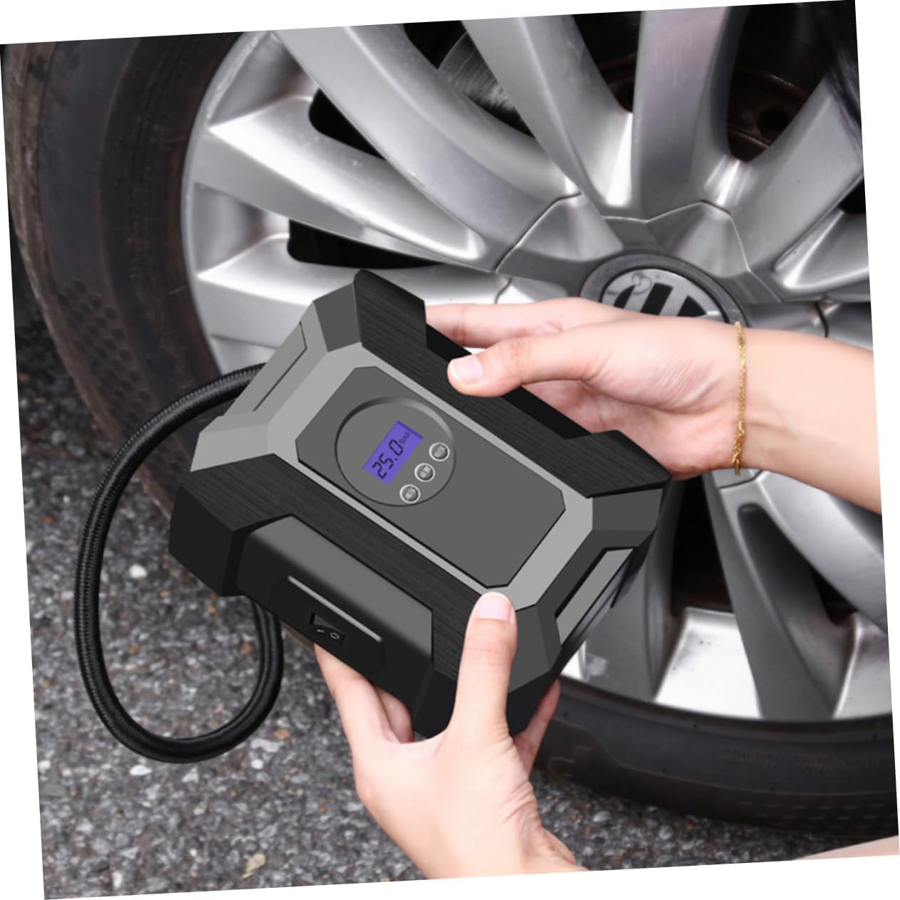 pompe gonflable automobile ce câble d’alimentation du compresseur d’air portable dans la prise de du 12v de la voiture, réglez la valeur de pression requise par le pneu, puis appuyez sur la buse de gonflage dans les valves du pneu et appuyez sur pour commencer à gonfler. Pompe à pneu d’automobile, la pompe du compresseur d’air s’éteint automatiquement lorsque la pression des pneus souhaitée est atteinte.