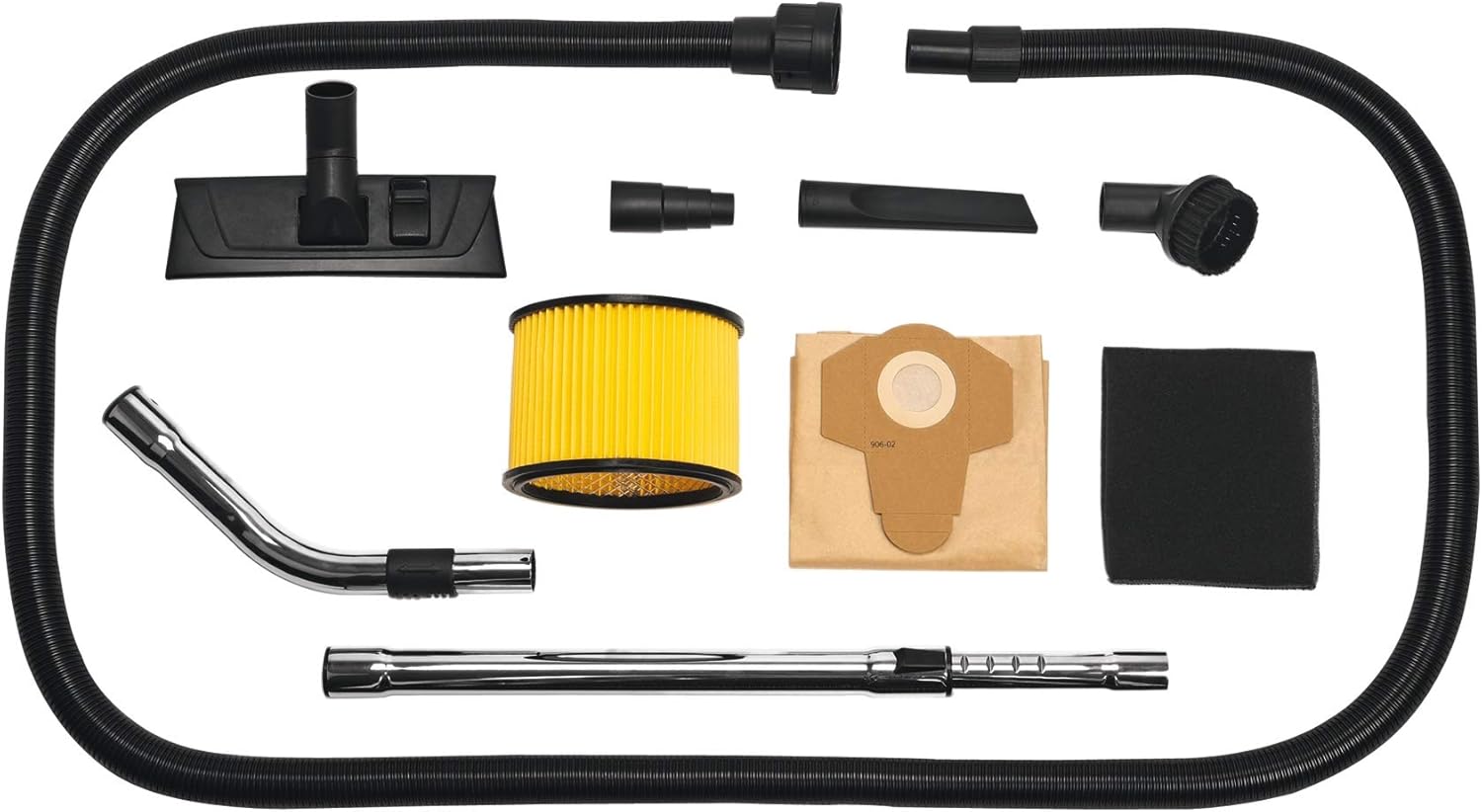 Cet aspirateur eaux et poussière est livré avec un tuyau d’aspiration de 3 m de long avec régulateur d’air, un tuyau d’aspiration télescopique en acier inoxydable, une buse pour sol lisse et tapis, un adaptateur pour le raccordement d’appareils électriques, une buse pour crevasse et une buse pour le capitonnage
