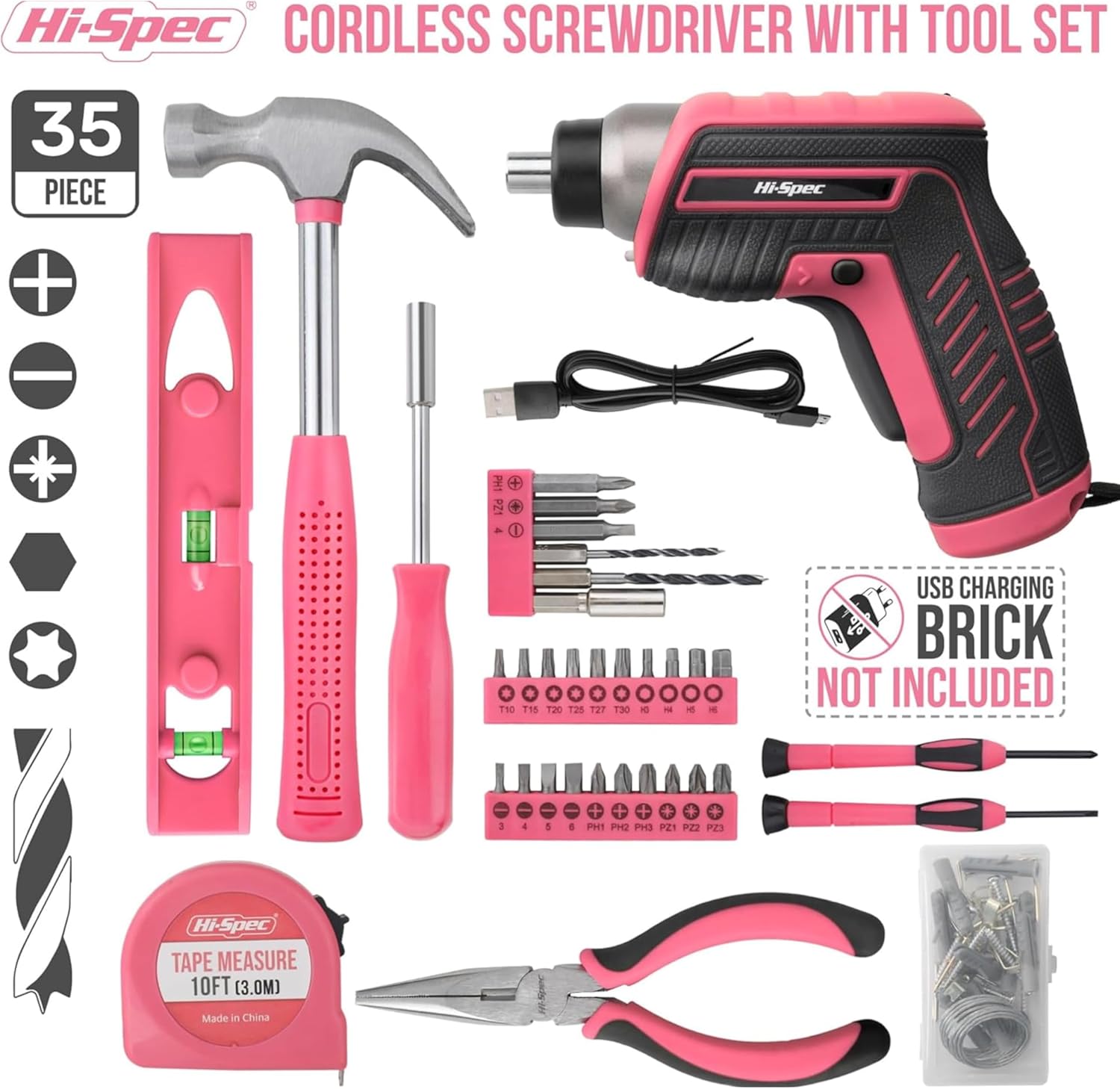 Hi-Spec 35pc Rose 3.6V USB Tournevis électrique et kit d’outils manuels
