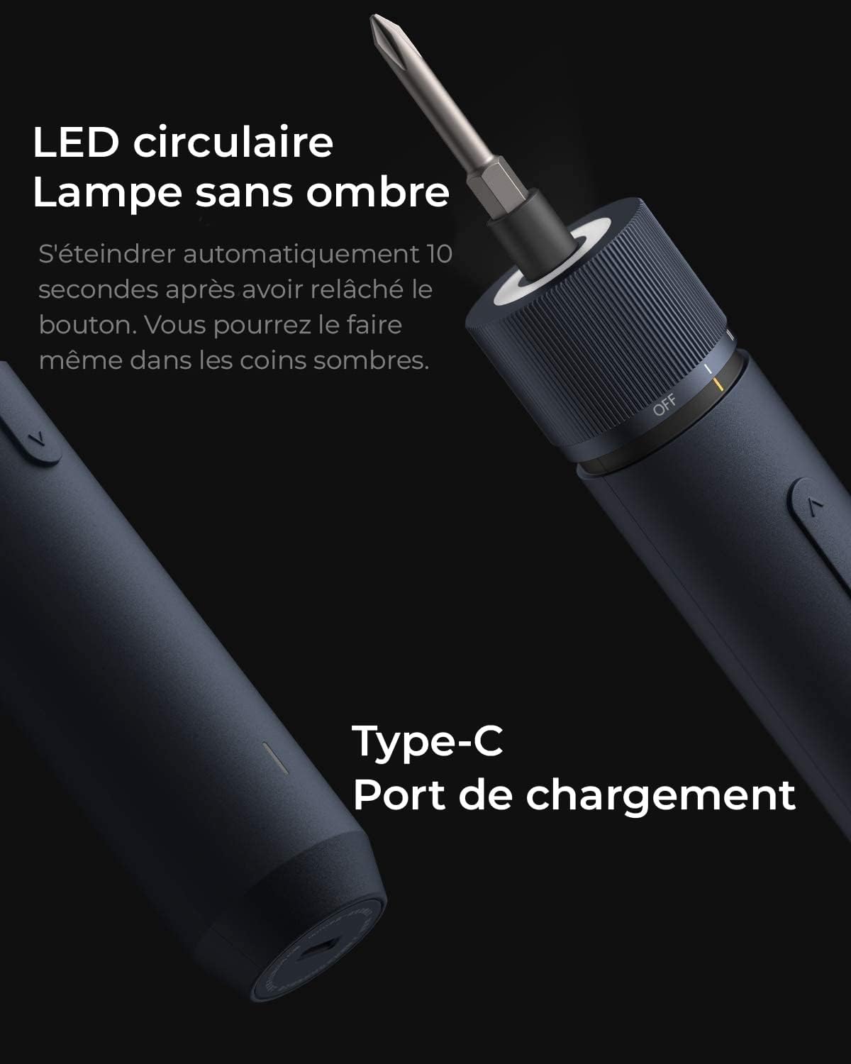 MINIMALISTE MAIS HAUTEMENT FONCTIONNEL : La batterie de grande capacité de 1500 mAh, Visseuse sans Fil qui a subi 37 tests de sécurité, offre une endurance ultra longue permettant au tournevis de faire fonctionner plus de 1000 vis lorsqu’il est complètement chargé. Le moteur magnétique à grande vitesse et la boîte de vitesses métallique fournissent une puissance de sortie puissante et stable au tournevis sans fil. Et l’interface de charge universelle de type c rend le chargement du tournevis pratique.