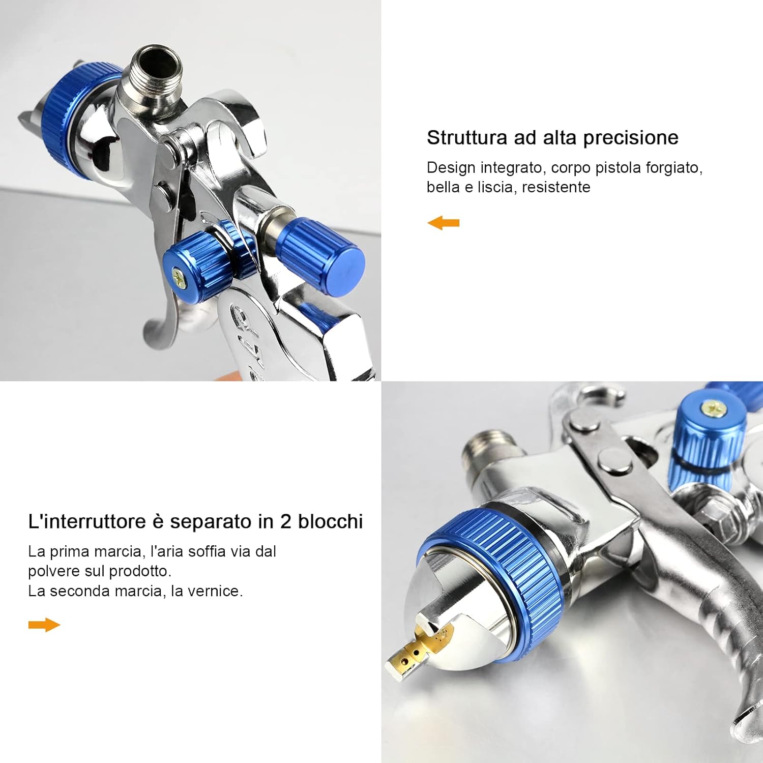 Détails garantis: flux en cuivre intégral de haute qualité, noyau de valve métallique, filtres rendant la pulvérisation plus douce et facilement contrôlable et réduisant l’overspray. La buse à aiguille est spécialement traitée pour améliorer l’étanchéité, la durabilité et l’utilisation de peintures à base d’eau. Toutes les pièces de la machine sont amovibles pour faciliter le démontage et le nettoyage.