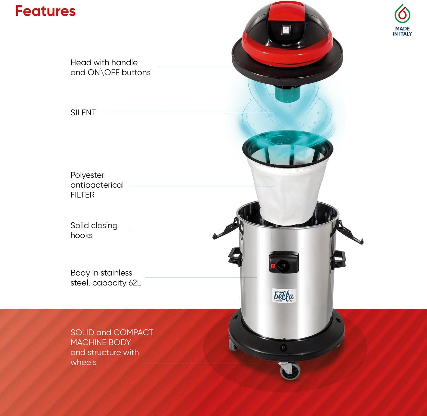 Moteur monostade haute vitesse ; by-pass : grande efficacité énergétique (1,5 kW) et silencieux, 72 dB(A)Bidon aspirateur en acier inoxydable avec filtre spécial anti-bactéries, parasites, champignons et virusManiable et ergonomique : roues pivotantes, crochets de tête pratiques et durables, poignée avec fixation à vis (évite le détachement involontaire), bouton marche/arrêt facilement accessible. Composants antidérapants. Câble de 8,5 m de long : permet d’atteindre n’importe quel endroit de la pièce sans avoir à changer de prise électrique. Enrouleur de câble pratique sur la tête de lit, pour bien enrouler le fil avant de ranger l’aspirateur.
