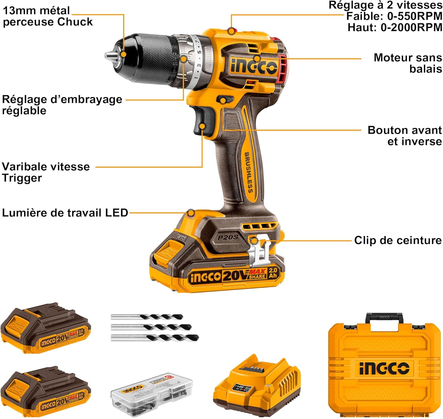 Moteur sans balais, Tension: 20V, Vitesse à vide: 0-550/0-2000 tr/min, Couple maximal: 60Nm, Capacité du mandrin: 13mm, Réglage du couple: 22+1+1, Engrenage mécanique à 2 vitesses