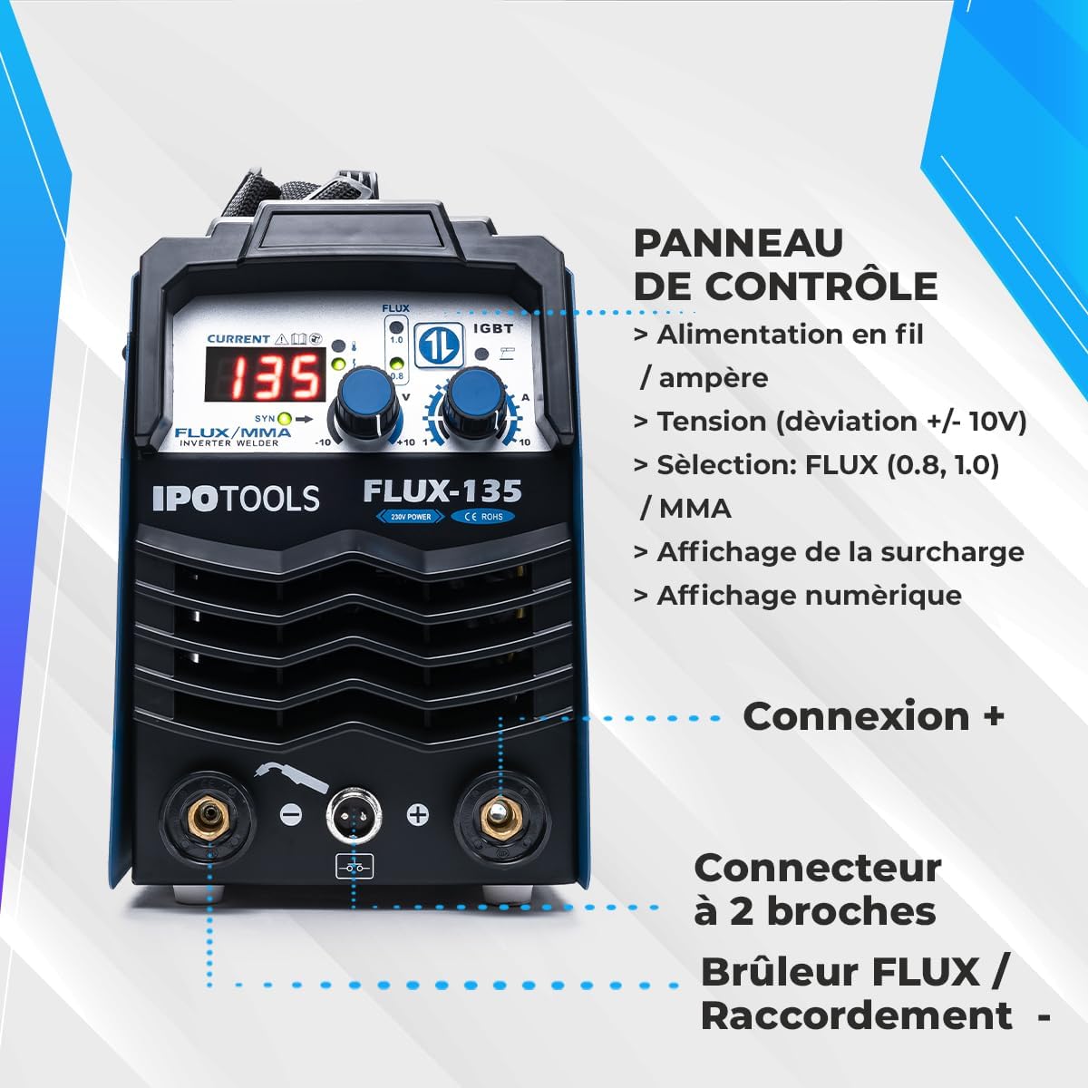 ▲ POSTE DE SOUDAGE AU FIL ALIMENTAIRE 3 EN 1 : Le FLUX-135 d’IPOTOOLS est un poste de soudage au fil fourré innovant 3 en 1 sans gaz, idéal pour le soudage au fil fourré avec fonction synergique et le soudage à l’électrode jusqu’à 135A. Avec sa technologie IGBT moderne, il offre une puissance et un facteur de marche élevés, parfaits pour toutes les tâches de soudage