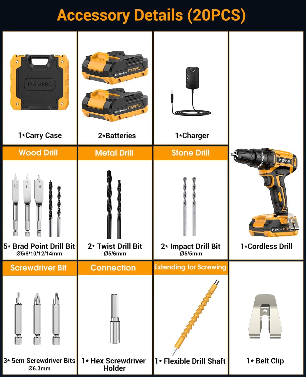 【Matériau de qualité supérieure】Le jeu de forets JYGMPRO amélioré utilise de nouveaux matériaux et fournit des accessoires plus durables, livré avec perceuse sans fil * 1, batterie 2,0 Ah * 2, un chargeur * 1, étui de transport * 1, manuel d’utilisation * 1, forets à pointe brad * 5, forets hélicoïdaux * 2, forets à percussion * 2, embout de vissage * 3, flexible pour perceuse * 1, support de tournevis hexagonal * 1, clip de ceinture * 1 inclus.