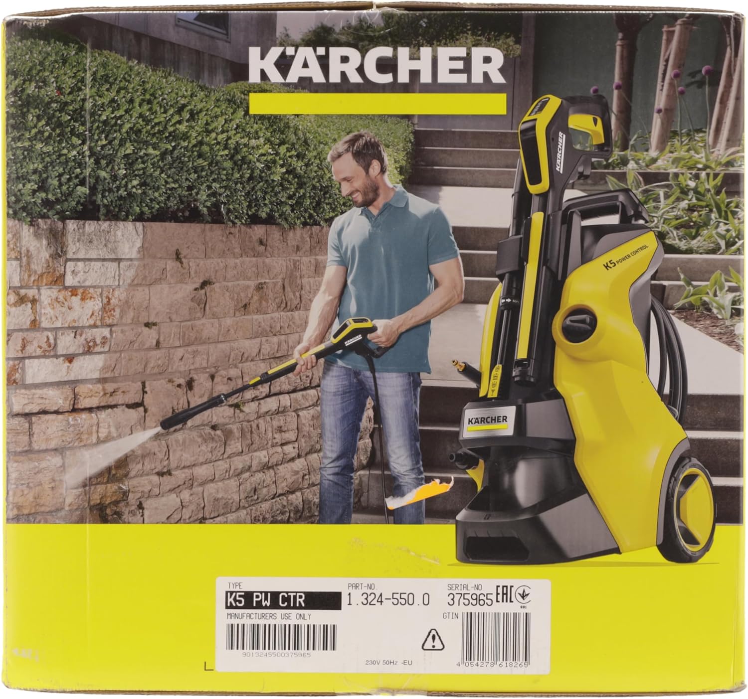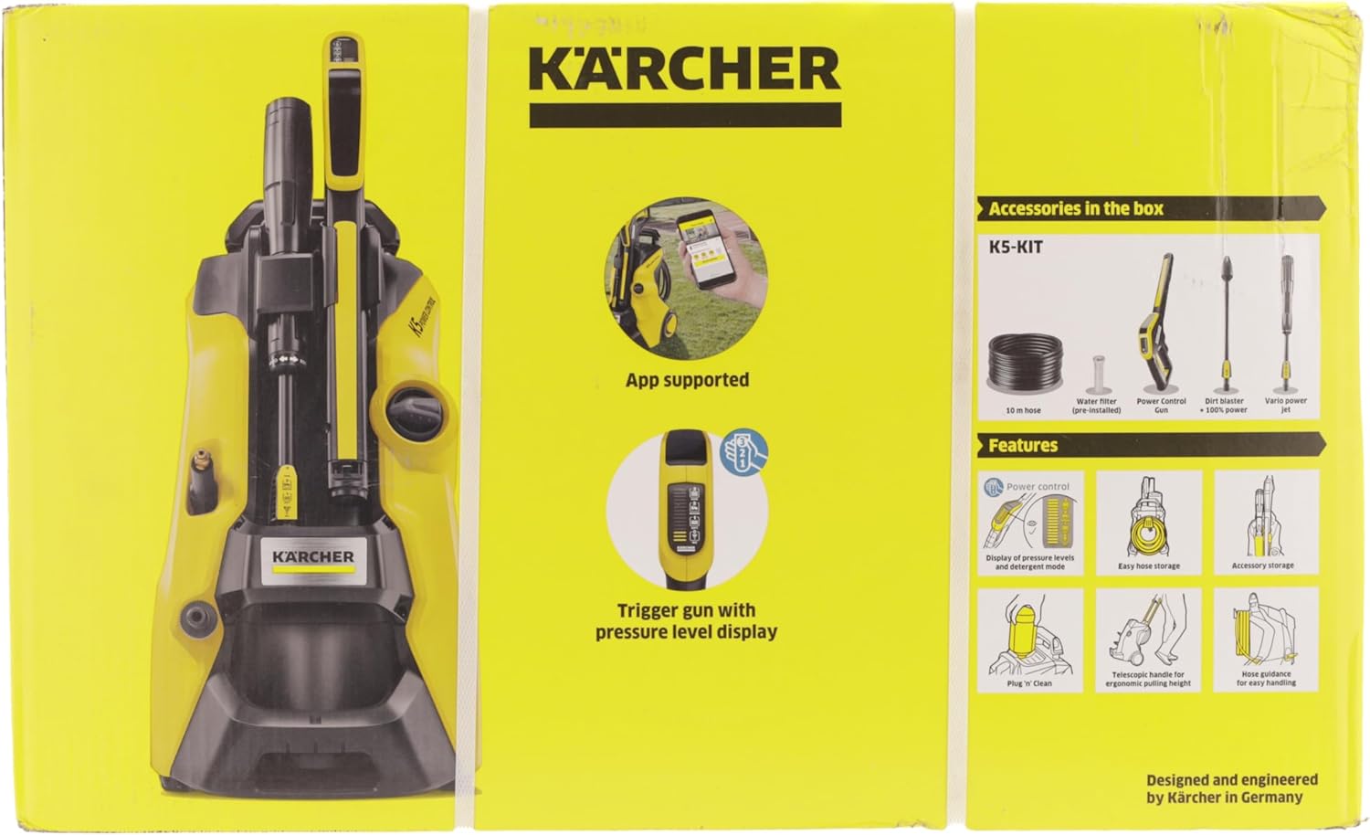 Contenu de la livraison : le kit comprend le nettoyeur haute pression K 5 Power Control de Kärcher, un pistolet et un flexible de 10 mètres haute pression, une lance Vario Power Jet et une rotabuse
