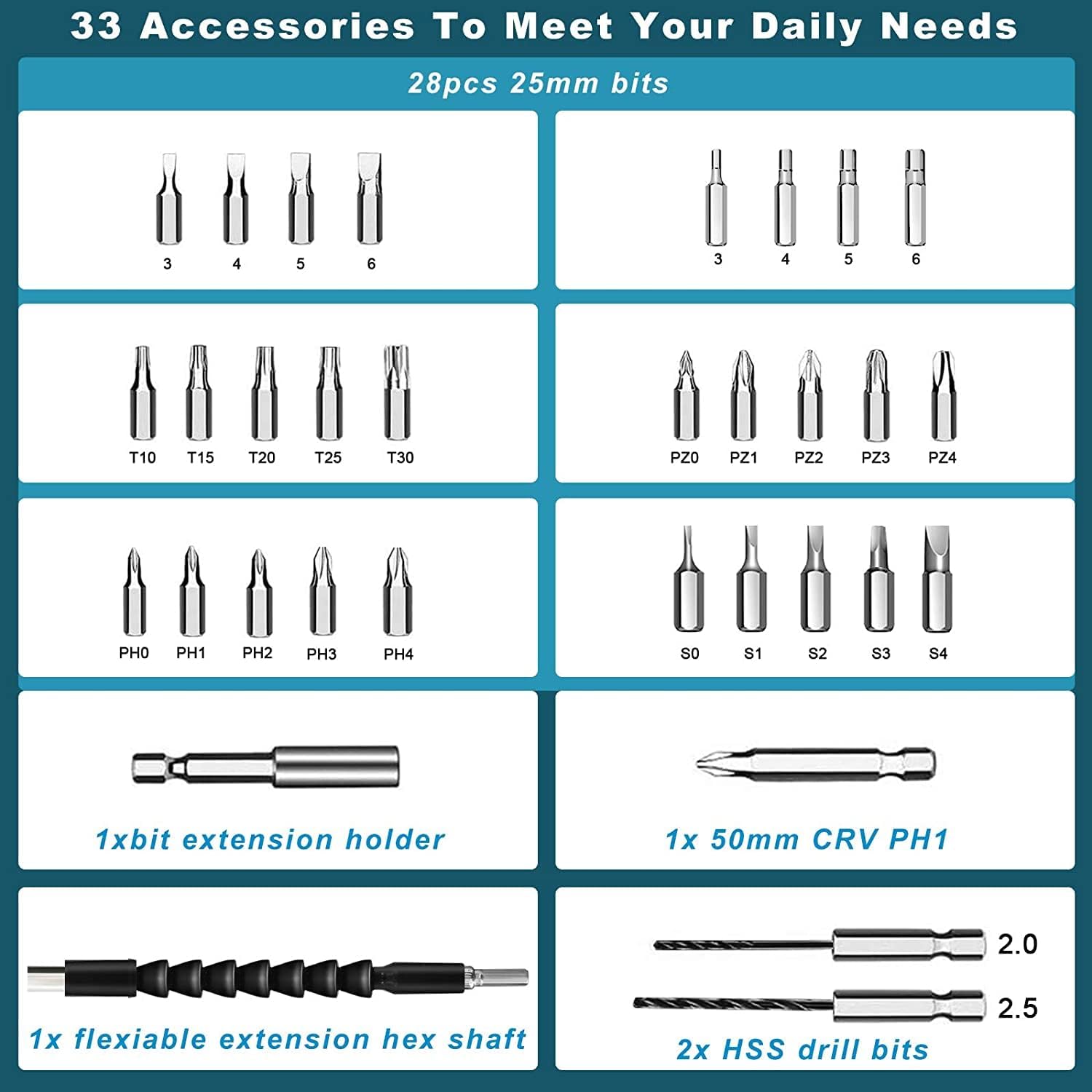 1 pièce 50 mm CRV PH1;2 mèches HS 2.0 2.5;1 porte-embouts de 60 mm;1 barre d’extension flexible