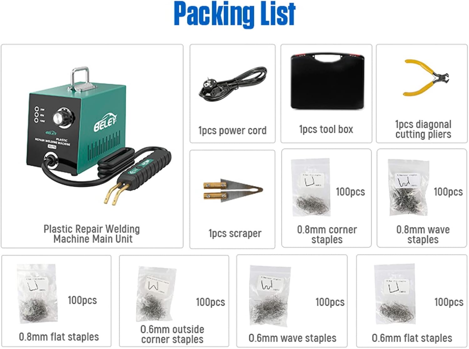 Vous pouvez obtenir: Soudeur * 1, pince diagonale * 1, grattoir * 1 boîte en plastique * 1600 agrafes (100 agrafes plates de 0,6mm / 0,8mm, 100 agrafes ondulées de 0,6mm / 0,8mm, 100 agrafes d’angle de 0,8mm et 100 agrafes d’angle de 0,6mm). Beley offre un remboursement de 30 jours et une garantie de 2 ans. Si vous rencontrez des problèmes d’utilisation, n’hésitez pas à nous contacter et nous vous aiderons dans les 24 heures.