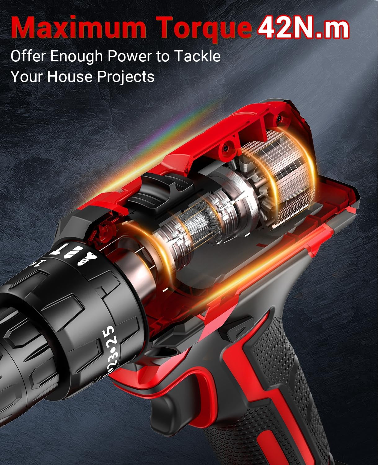 【2 Vitesses Variables et Embrayage à 25 Positions】 La perceuse électrique peut être réglée pour fonctionner dans deux plages de vitesse différentes (0-550 tr/min, 0-1850 tr/min), de sorte que vous aurez toujours la puissance dont vous avez besoin. De plus, le visseuse perceuse sans fil dispose de 25 positions de couple pour la sélection du mandrin, offrant une opération plus précise pour le perçage et le vissage.