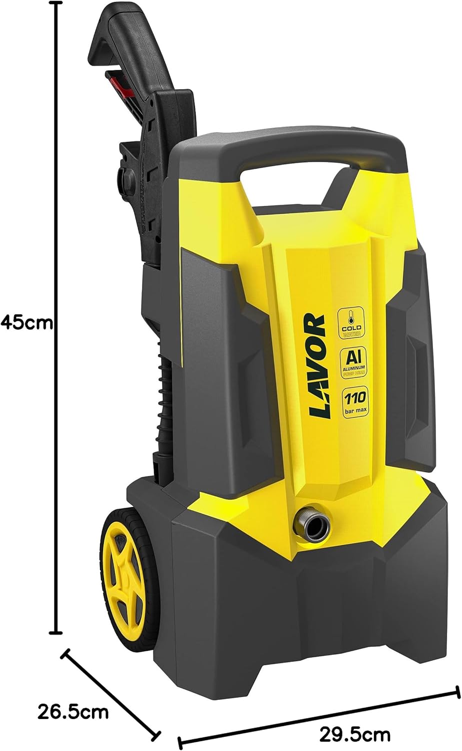 Nettoyeur haute pression à eau froide caractérisé par une conception légère, a une pression maximale de 110 bar, un débit maximal de 330 litres par heure et un moteur de 1500 Watt