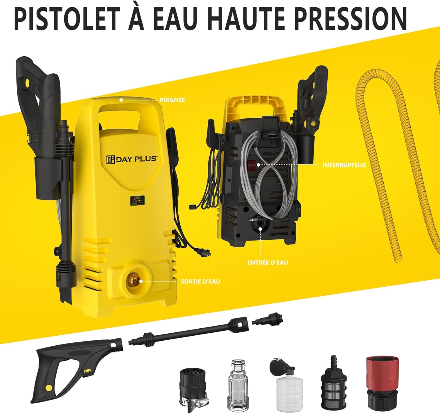 Valeur Ajoutée: Livré avec un tuyau haute pression de 7 m (connexion métallique) et un câble d’alimentation de 5,5 m.La technologie du nettoyage à haute pression ne cessant de progresser et le nettoyage devant être rapide et efficace, les nettoyeurs à haute pression sont devenus un outil de nettoyage essentiel pour chaque foyer ! Si vous avez des questions, n’hésitez pas à nous contacter et nous vous répondrons dans les 24 heures