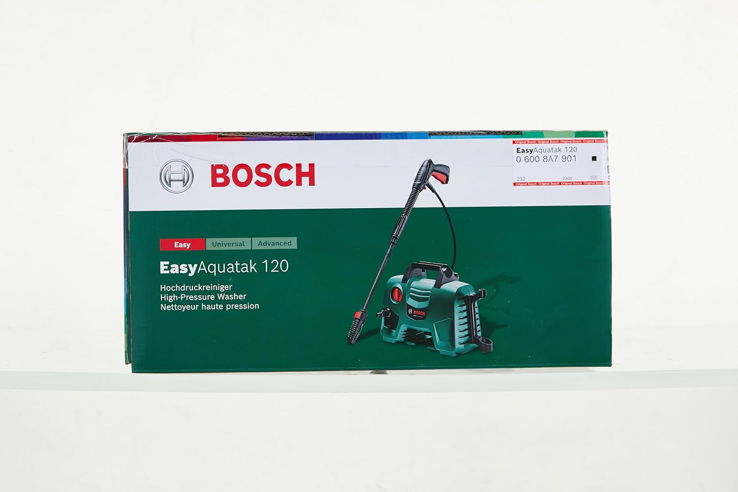 Livré avec : EasyAquatak 120, pistolet haute pression, flexible de 5 m, buse rotative, buse à détergent haute pression, buse à jet en éventail variable, filtre à eau, emballage carton