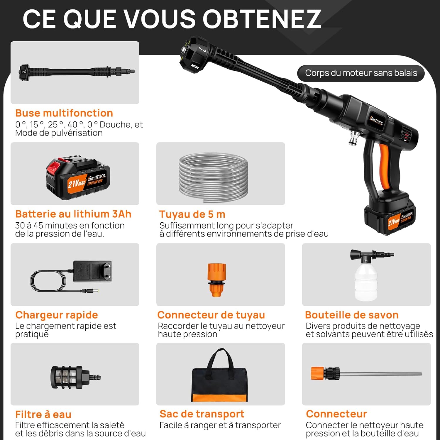 【Qu’est-ce que vous recevrez?】1 x Buse multifonction;1 x Batterie au lithium 3Ah;1 x Chargeur rapide;1 x Filtre à eau;1 x Tuyau 5M;1 x Connecteur de tuyau;1 x Sac de transport;1 x Bouteille de savon;1 x Connecteur Note : Le lave-auto sans fil a passé un contrôle de qualité et de sécurité avant de quitter l’usine. Si vous avez des questions, n’hésitez pas à nous contacter, nous serons heureux de vous servir !