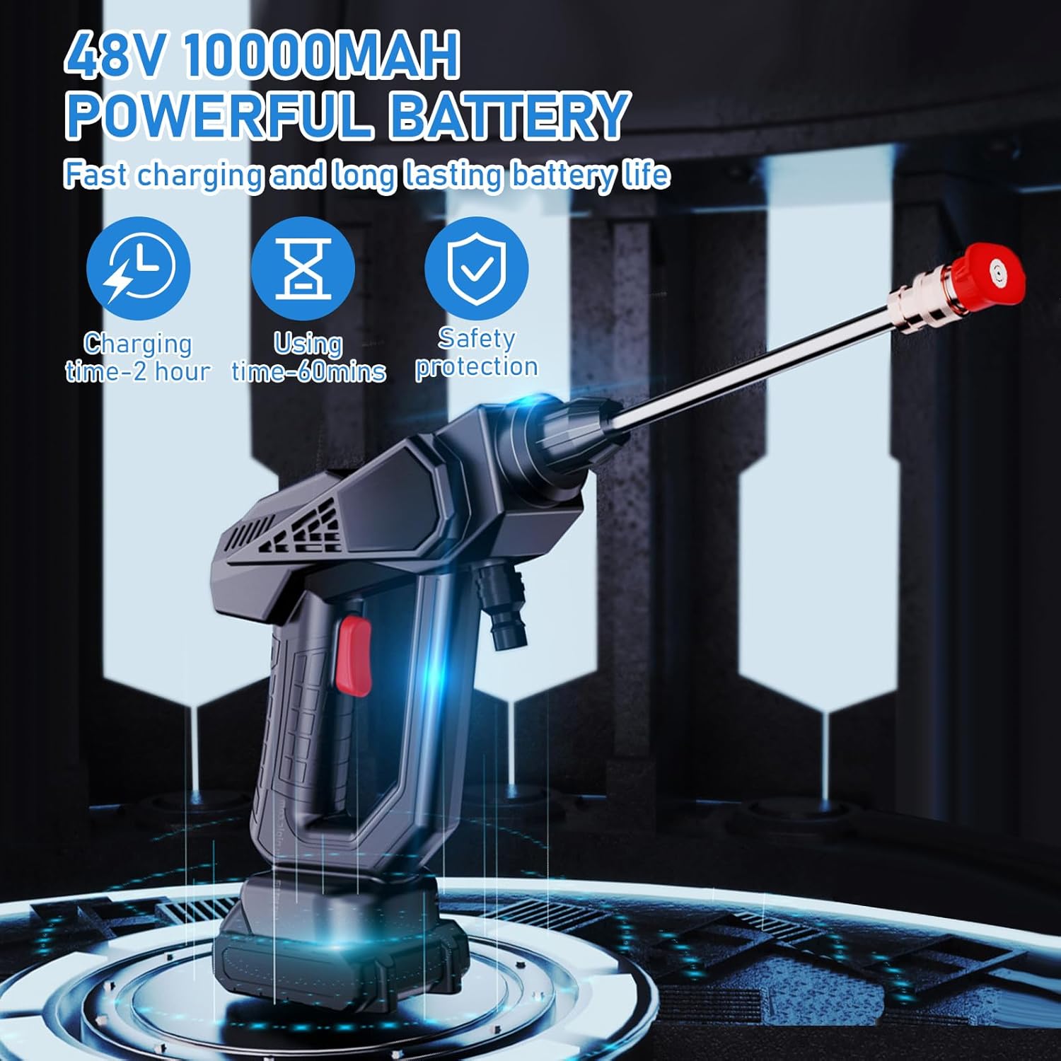4. Le nettoyeur haute pression portable est suffisamment puissant avec une batterie de 48 V. Le type d’eau de pulvérisation peut être changé librement en jet direct haute pression, jet en forme d’éventail, jet de douche (jet direct haute pression sans buse).