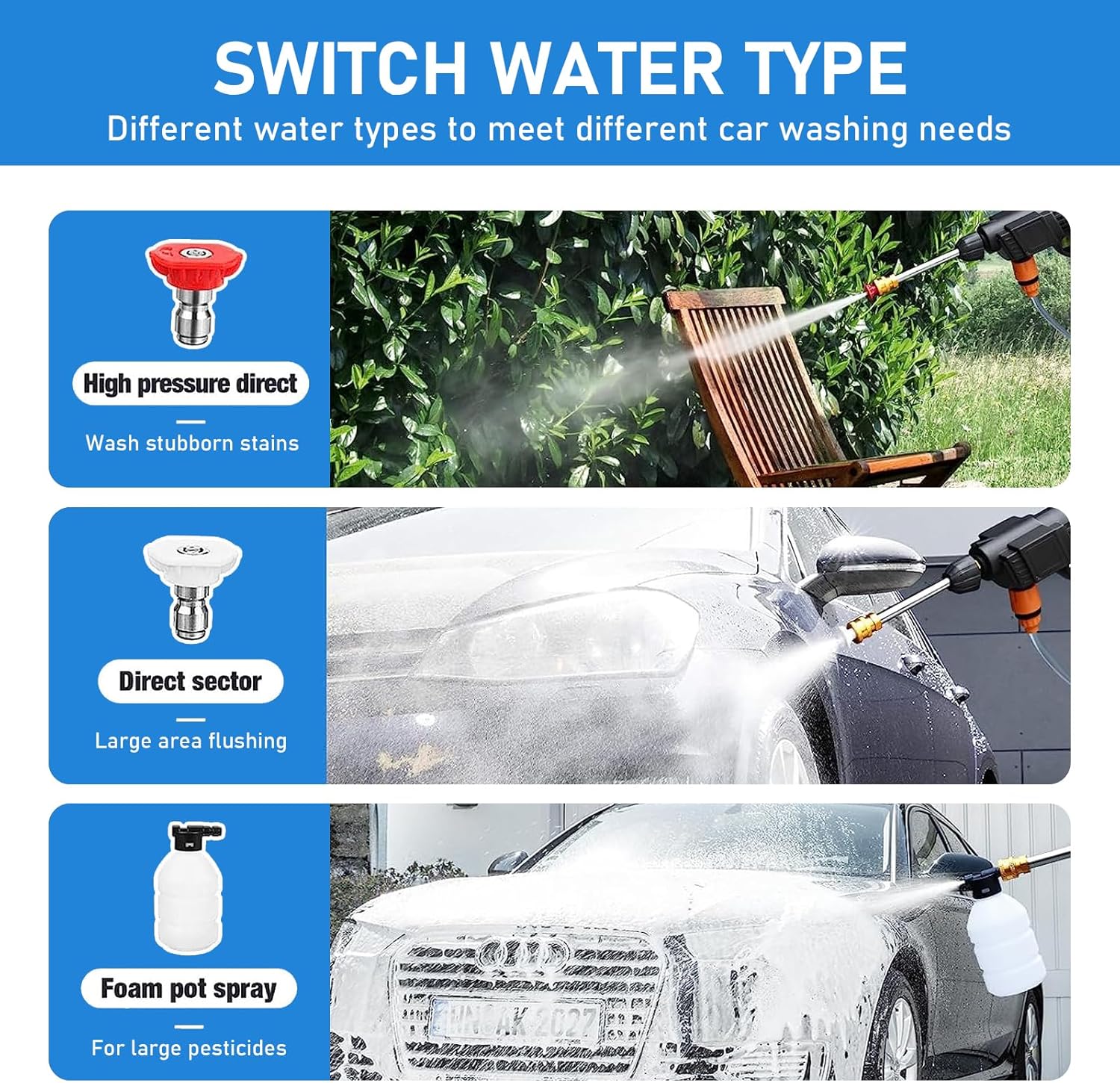 【Applications multiples】Convient pour l’arrosage du jardin, l’irrigation agricole, le lavage de voiture, le nettoyage domestique et les coins et recoins difficiles à nettoyer manuellement. C’est l’outil de nettoyage le plus idéal pour les unités d’entretien des voitures personnelles et des petites voitures pour nettoyer les voitures et les motos.