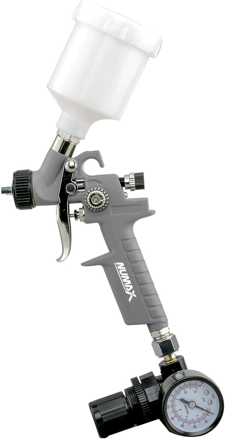 Le mini pistolet pulvérisateur pneumatique HVLP Numax SPS08 avec pointe de 0,8 mm et gobelet en plastique de 125 cc est parfait pour pulvériser de la peinture. Utilisez ces éclaboussures de peinture à air comprimé pour des projets autour de la maison, tels que la peinture de meubles et le travail du bois, ainsi que des applications automobiles et industrielles. Ce pistolet pneumatique haute pression à haut volume produit des performances élevées avec un meilleur transfert de peinture et moins de surpulvérisation. Trois boutons de contrôle réglables (motif, contrôle du fluide et de l’air) offrent une grande polyvalence avec précision. Le bouton de contrôle du motif vous permet de basculer entre une pulvérisation complète ou ronde, et le contrôle du liquide régule la quantité de peinture mélangée à l’air du compresseur. Le régulateur d’air est utilisé pour augmenter ou diminuer le flux d’air. En outre, la rotation de l’anneau du bouchon d’air à l’extrémité de la buse ajuste la direction du ventilateur de pulvérisation verticalement ou horizontalement, utile lors de la pulvérisation des deux côtés vers les côtés ou de haut en bas. La gâchette de ce pistolet pulvérisateur a un design en deux étapes. Appuyez sur la gâchette jusqu’à la première étape et connectez-la à la source d’air pour garantir le flux d’air. Une pression supplémentaire permet au pistolet pulvérisateur de verrouiller la peinture dans la tasse de gravité de 125 cc. Le corps ergonomique monobloc de ce pulvérisateur de peinture miniature est fabriqué en aluminium, tandis que l’aiguille et la buse sont en acier inoxydable. Il en résulte un outil équilibré, léger et durable qui est excellent pour une utilisation sur de longues périodes. Un régulateur et deux types différents de raccords d’air NPT de 6,35 mm sont inclus (standard et automobile), ainsi qu’un kit de nettoyage et un outil de réglage. Le mini pistolet pulvérisateur pneumatique HVLP avec pointe de 0,8 mm et gobelet en plastique de 125 cc réduit les coûts de peinture et augmente la productivité pour les bricoleurs et les entrepreneurs.