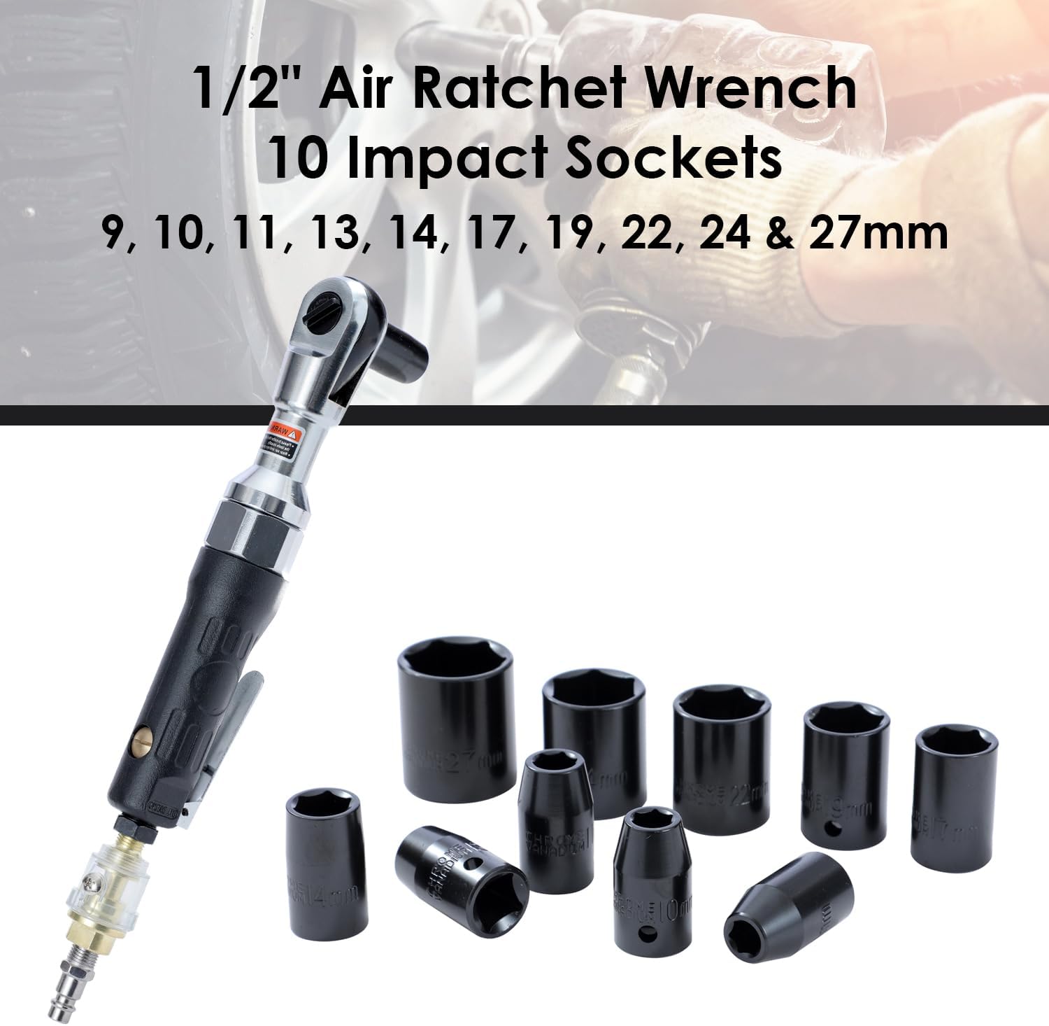 10 douilles à chocs : 9, 10, 11, 13, 14, 17, 19, 22, 24 et 27 mm.