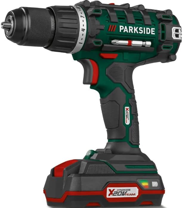 Perceuse-visseuse sans fil Parkside PABS 20-Li E6 20 V, avec batterie et chargeur. Caractéristiques : puissante batterie lithium-ion de 20 V (2,0 Ah). Moteur puissant avec transmission à 2 vitesses. Mandrin à serrage rapide avec verrouillage radial et manchon en métal. Vitesse de rotation réglable en continu avec fonction Quickstop. Lampe de travail LED intégrée, 2 supports d’embouts sur l’appareil. Poignée souple antidérapante. Clip de ceinture pratique. Avec fonction décapsuleur, chargeur avec arrêt automatique de charge et indicateur de charge LED. Diamètre de perçage : 30 mm dans le bois / 13 mm dans l’acier Batterie compatible avec tous les appareils de la série « PARKSIDE X 20 V Team » Accessoires inclus : 8 embouts à vis (PH0, PH1, PH2 / PZ0, PZ1, PZ2 / SL5, SL6) et 8 forets HSS (1,5 / 2,5 / 3 / 4 / 4 / 5. 6 / 8 / 10 mm) Caractéristiques techniques Batterie : lithium-ion 20 V (2,0 Ah) Vitesse de rotation : 1. Vitesse : 0-400 tr/min / 2. Vitesse : 0-1400 min¹ Niveaux de présélection du couple : 25 + 1 niveau de perçage max. Couple : 45 Nm – Largeur du mandrin : 1,5 – 13 mm – Temps de charge : environ 60 min (à 20 V, 2 Ah) – Dimensions : environ 211 x 232 x 90 mm – Poids : environ 1650 gr