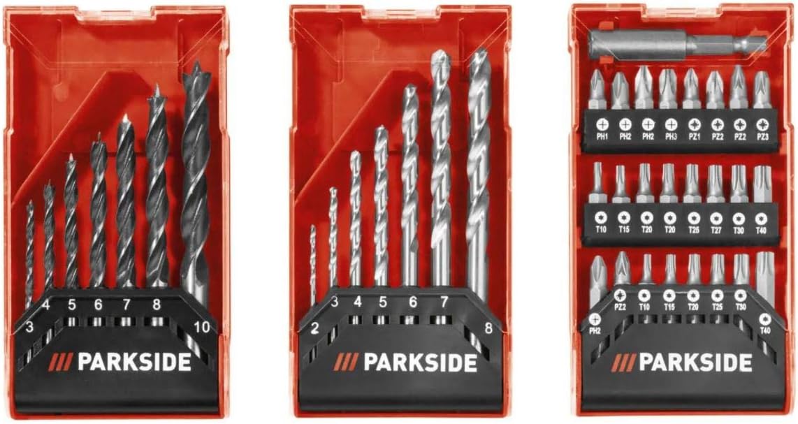 Description Moteur sans balais efficace, puissant et résistant à l’usure Commutation rapide et sans outil entre les fonctions perçage et vissage Entraînement à 2 vitesses avec vitesse réglable en continu et fonction d’arrêt rapide Mandrin métallique sans clé Verrouillage automatique de la broche SPINDLE LOCK 20 vitesses et une vitesse de perçage Etat de la batterie affichage sur trois niveaux sur l’appareil Éclairage LED intégré Avec poignée antidérapante Chargeur rapide pour moins de 6 charges 0 minutes 0 minutes et avec arrêt automatique du processus de charge Appareil compatible avec la batterie de la PARKSIDE X 12V Team série Comprend 2 batteries, un ensemble d’accessoires de 39 pièces, un chargeur et un sac pratique. Informations techniques Batterie : 12 V lithium-ion (2 Ah) Couple : max. 30 Nm Vitesse : 1ère vitesse 0 400 tr/min / 2ème vitesse 0 1400 tr/min Diamètre de perçage : max. 19 mm (bois) / 10 mm (acier) Vitesses de rotation : 20 + 1 vitesse de perçage Plage de serrage du mandrin : 0,8 10 mm Par rapport à la perceuse sans fil Parkside PBSA 12 D4 : durée de fonctionnement jusqu’à 20 % plus longue du moteur jusqu’à 10 fois plus longue Accessoires Autonomie 20 % plus longue incluse Piles, jeu d’accessoires Jeu de 39 pièces composé de 7 forets à métaux, 7 forets à bois et un jeu de 25 forets, 1 chargeur et un sac pratique