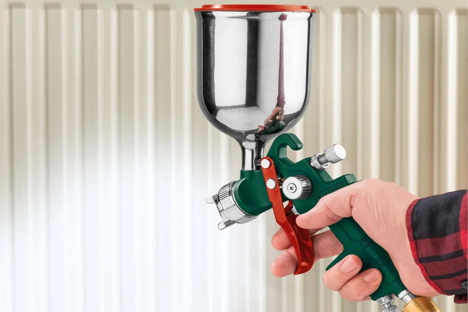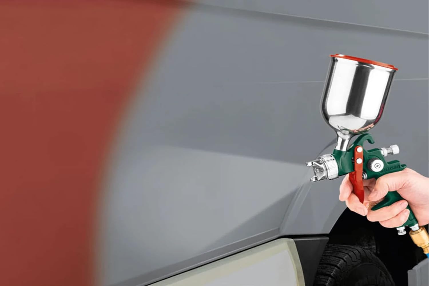 Application optimale de la peinture grâce à la technologie basse pression. Brume de pulvérisation réduite et progression rapide du travail. Conception en métal léger de haute qualité avec régulation de la quantité de couleur.