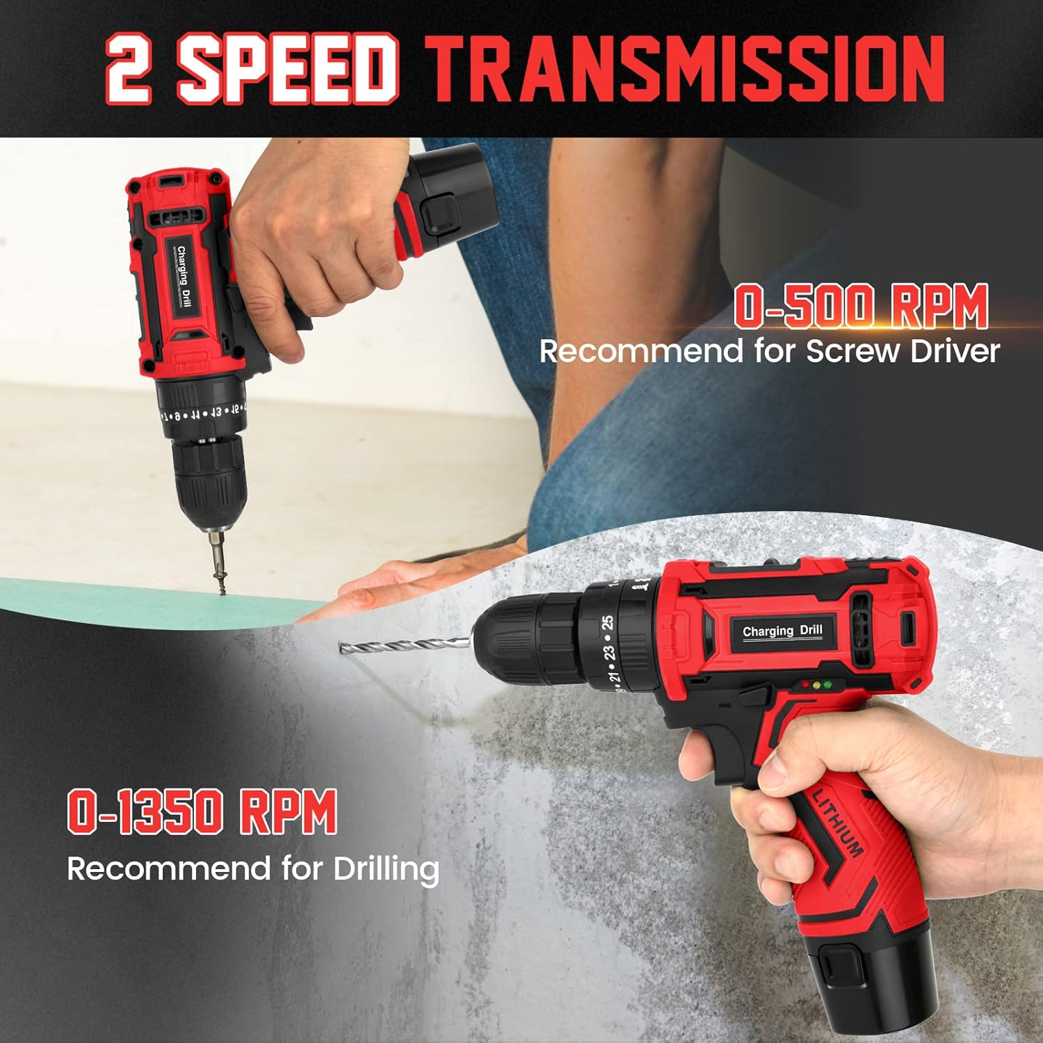 La perceuse offre 2 vitesses (0-500, 0-1350 tr/min) : basse pour visser et haute pour percer.
