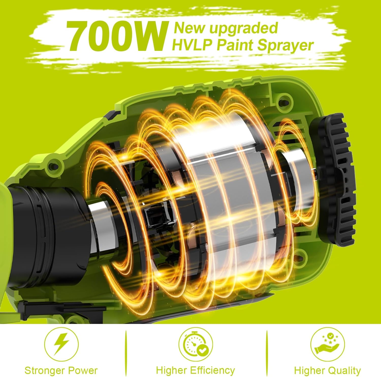 3.Performance Renforcée pour une Plus Grande Efficacité : Le pistolet peinture electriqueHVLP de 700W offre une performance plus puissante, améliorant l’effet de pulvérisation de la peinture. Équipé d’un grand réservoir de 1200 ml, il est particulièrement adapté pour la pulvérisation de grandes surfaces. Avec une viscosité maximale augmentée à 100Din-s, l’effet de pulvérisation est considérablement amélioré, ce qui se traduit par une finition de peinture lisse et supérieure