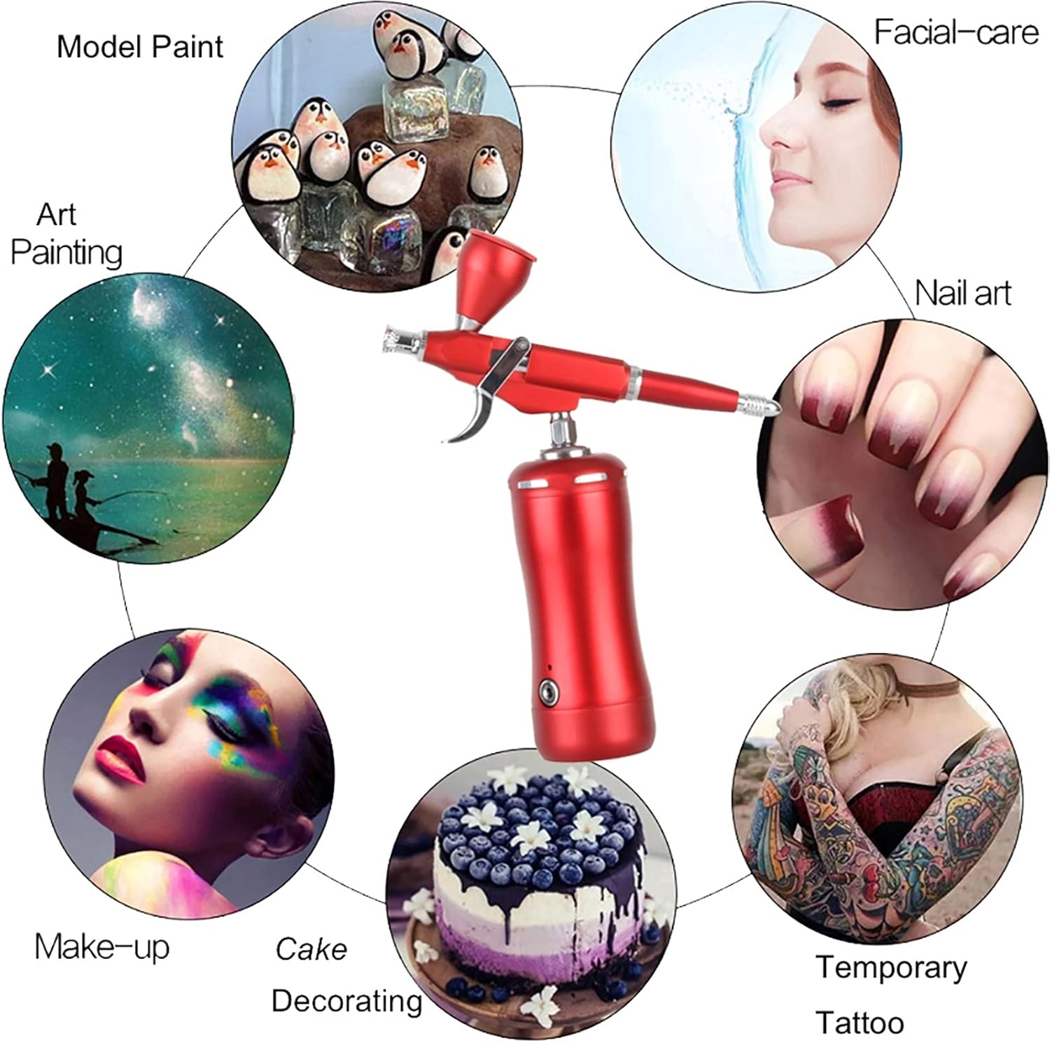 AIRBRUSPORTABLE & MULTIFONCTIONNELLe kit de peinture pour aérographe peut être placé dans votre sac à dos ou votre poche, il est léger et facile à transporter. Le kit aérographe portable sans fil peut être utilisé pour la décoration de gâteaux, le maquillage, conception d’ongles, tatouage, peinture de modèle, peinture d’art, artisanat et ainsi de suite. L’aérographe doit être soigneusement nettoyé après chaque utilisation pour éviter le colmatage de la buse ou une pulvérisation inégale.