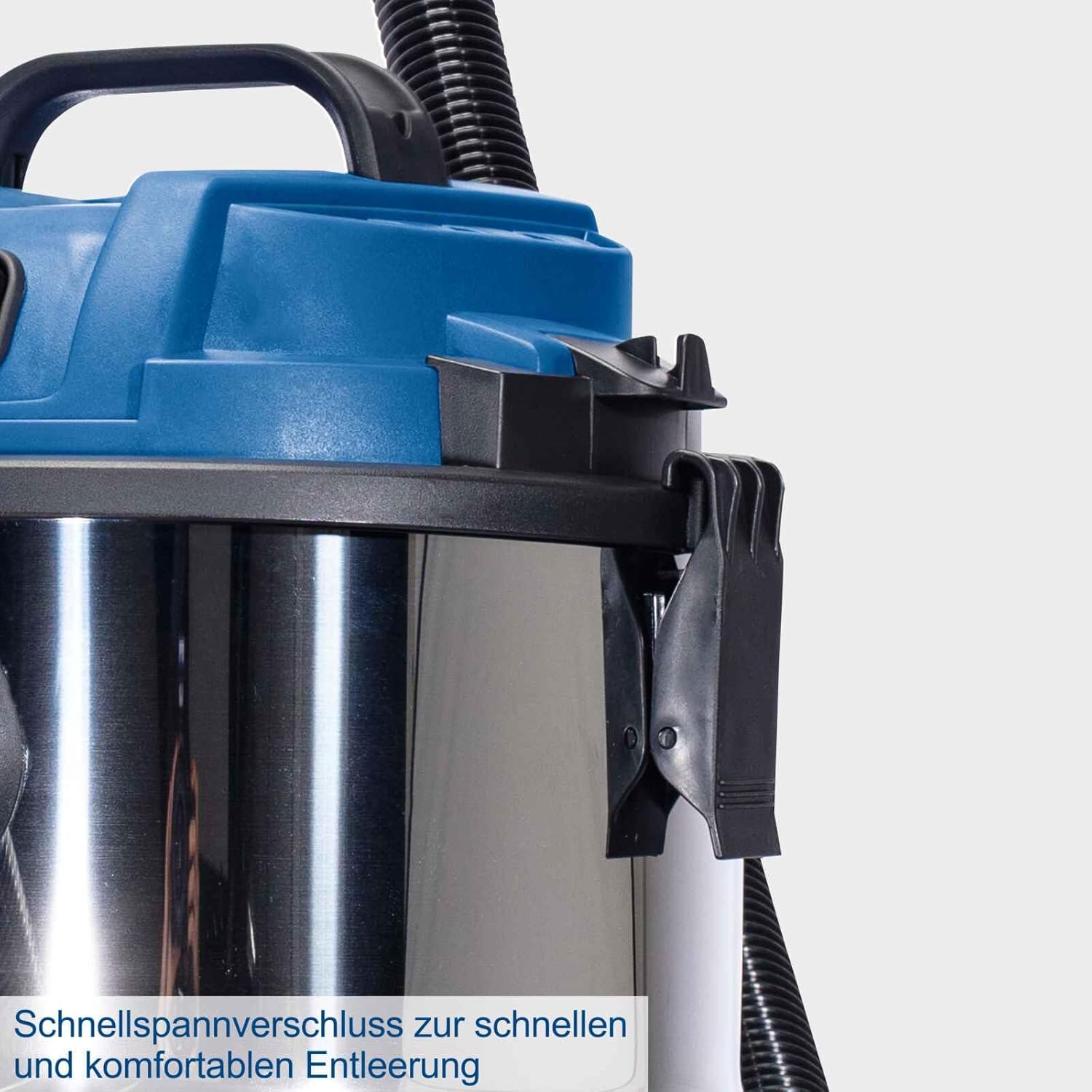 Avec la poignée, le support de câble intégré, le réservoir robuste en acier inoxydable et les roulettes pratiques, le scheppach NTS20 est une possibilité de couvrir la totalité des besoins toutes au tour de la maison ainsi que le secteur de l‘atelier. Le puissant moteur de 1200 W permet une puissance d‘aspiration fiable et puissante. Grâce à un large rayon d’action de 6 m, l‘aspirateur eau et poussières aspirer dans les coins les plus éloignés. En outre, le NTS20 dispose d‘une fonction de soufflage intégrée, ce qui facilite de nombreux travaux. Particules humides ou sèches, poussières grossières ou copeaux fins, l’aspirateur eau et poussière NTS20 aspire tout. Maniable, l’aspirateur est équipé d’une poignée de transport et de quatre roulettes, ce qui permet une utilisation flexible dans l’atelier, dans la maison ou pour nettoyer la voiture. Le tuyau d’aspiration de 38 mm est en trois parties et peut être démonté pour un stockage compact. Associé au flexible d’aspiration de 2 m, il garantit un rayon de travail acceptable. Ce petit aspirateur suivra son utilisateur partout grâce aux roulettes mobiles au niveau des pieds. Un suceur et une grande buse combinée pour les tapis et les sols lisses viennent compléter le kit. Avec cet équipement, le NTS20 convient à n’importe quelle tâche. Un puissant moteur de 1 200 W génère une puissance d’aspiration de 20 kPa. Le réservoir en inox a une contenance de 20 l. En cas d’aspiration à sec, la poussière aspirée est collectée dans un sac en papier. Le sac de collecte des poussières en papier permet de vider le réservoir facilement et rapidement sans entrer en contact avec les poussières. Un filtre en mousse est fourni pour l’aspiration de produits humides. En outre, le NTS20 dispose d’un raccord de soufflage pour souffler les zones difficilement accessibles. Le câble et les accessoires peuvent être fixés directement sur l’aspirateur pour gagner de la place.