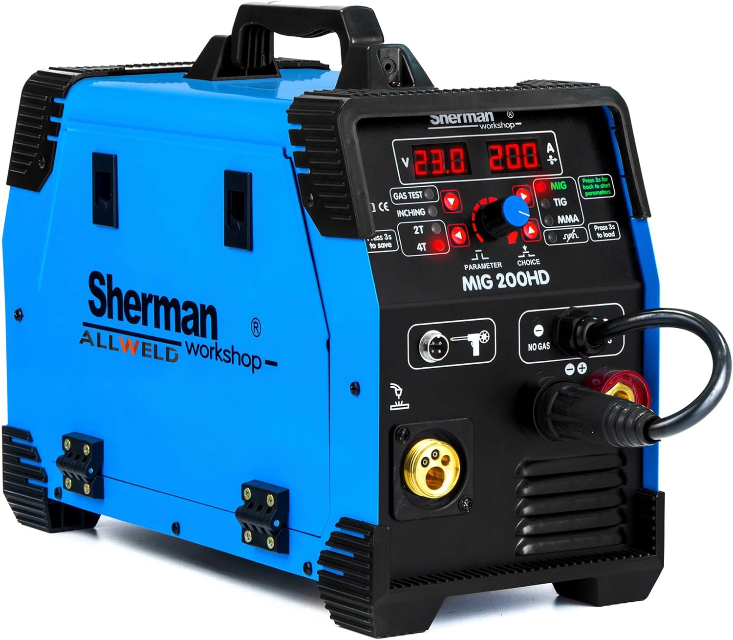 SHERMAN MIG 200 HD SYNERGY est une machine à souder multiprocessus avec réglages automatiques en mode MIG. Ces réglages rendent les paramètres très simples et intuitifs. L’ensemble comprend: – une source d’alimentation SHERMAN MIG 200 HD Synergy – une torche MIG MB15 – 3m – un support d’électrodes – 3m – une pince de masse – 2m -Insert de brûleur – Rouleau d’alimentation – 1 pièce – conseils de contact – Courant maximum: 30A – 200A – Cycle de travail: 45% – Diamètre compatible du fil: 0.8 / 0.9 / 1.0 mm – Bobine compatible du fil: 100mm/200mm/5kg – chargeur autonome du fil 2 rouleaux QUELS SONT LES AVANTAGES? Paramètres automatiques dans MIG – SYNERGY: permet d’obtenir des soudures de haute qualité avec une expérience de soudage minimale ou nulle! Inductance réglable le brasage – est utilisé pour les matériaux qui ne peuvent pas être soudés, comme le cuivre, les tôles galvanisées, etc. 2T / 4T – permet un fonctionnement facile et pratique de la torche, pas besoin de tenir la gâchette pendant le soudage! Pistolet à bobine compatible Protection contre la surchauffe III ensemble PROFESSIONNEL 1. Régulateur de bouteille Ar / CO2 MINI avec deux manomètres – 1 pièce 2. Tuyau 2m 3. Pinces 2 pièces 4. Fil à souder SG2 – 5kg 0 , 8mm 5. Gants de soudage 6. Ensemble d’accessoires MIG – SKU : MB 15 OPTI 0.8MM 7. Casque MAGNUM TURBO rouge 8. Angles 2 pièces 11 kg 9. Électrodes PATHON 1kg 2.5mm 10. Réducteur avec rotamètre 11. Tuyau 2m 12. Colliers 2 pièces 13. Gants TIG courts 14. Torche TIG avec valve : Torche TIG 17V / 4 SPARTUS 15. Fil TIG 0,5m HORDA 4Si 1 kg # COMPOSITION SET MIG OPTI : 5x tube contact 0,8 2x buse gaz 2x connecteur courant 2x isolateur