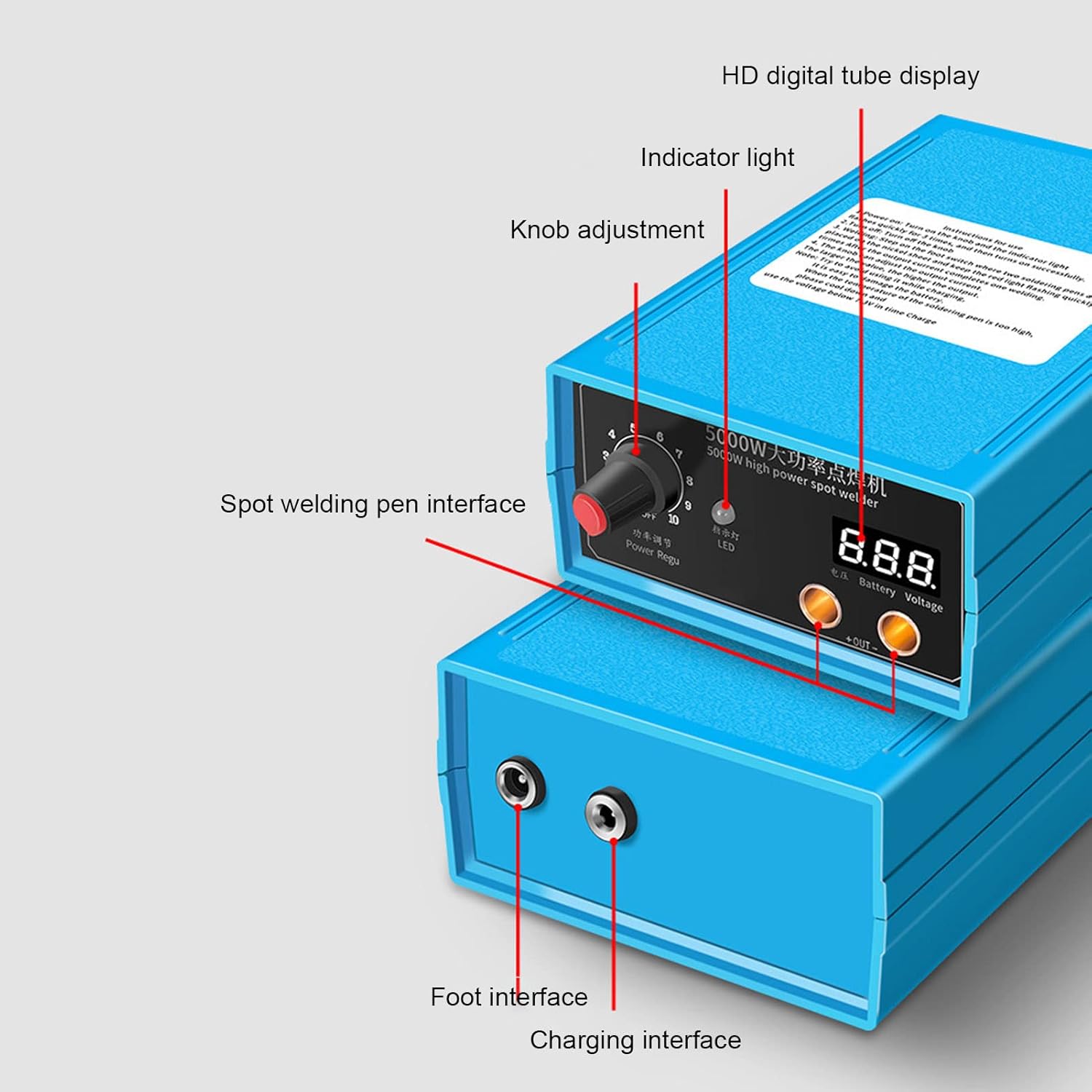 Mode d’emploi :1. Mise sous tension : allumez le bouton, le voyant clignote rapidement 3 fois, puis reste allumé, et la mise sous tension est réussie2. Arrêt : éteignez le bouton 3. Soudage : deux stylos de soudage sont placés sur la feuille de et l’interrupteur à pédale est enfoncé et maintenu. Après que le voyant rouge clignote rapidement trois fois, le courant primaire est émis pour terminer le soudage4. Le bouton peut régler le courant de sortie. Plus la valeur est élevée, plus la sortie est élevée. Remarque : essayez d’éviter de l’utiliser pendant la . Lorsque la température du stylo à souder est trop élevée, il est facile d’endommager la batterie, veuillez l’utiliser après refroidissementCharge rapide lorsque la tension est inférieure à 7,3 VLa température ambiante doit être comprise entre 10 ℃ et 65 ℃. Ne laissez pas l’eau pénétrer. Veuillez comprendre les instructions d’utilisation avant d’utiliser cette machine. Commutateur