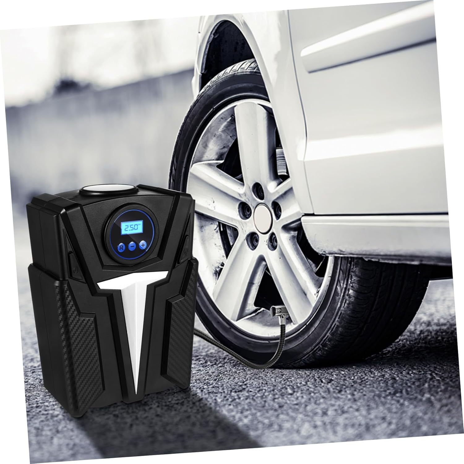compresseur d’air numérique ce compresseur d’air pour pneu de voiture peut gonfler vos pneus de voiture standard en une fraction du temps. compresseur d’air de voiture portable équipé d’un affichage numérique qui vous aide à vérifier la pression des pneus et les valeurs de pression des pneus prédéfinies. La pompe du compresseur prérégle le niveau de pression souhaité et démarre le travail de gonflage. Compresseur d’air pour voiture plus efficace avec un manomètre précis de la pression des pneus. Pompe à air portable pour les pneumatiques pour vous offrir une expérience sûre.