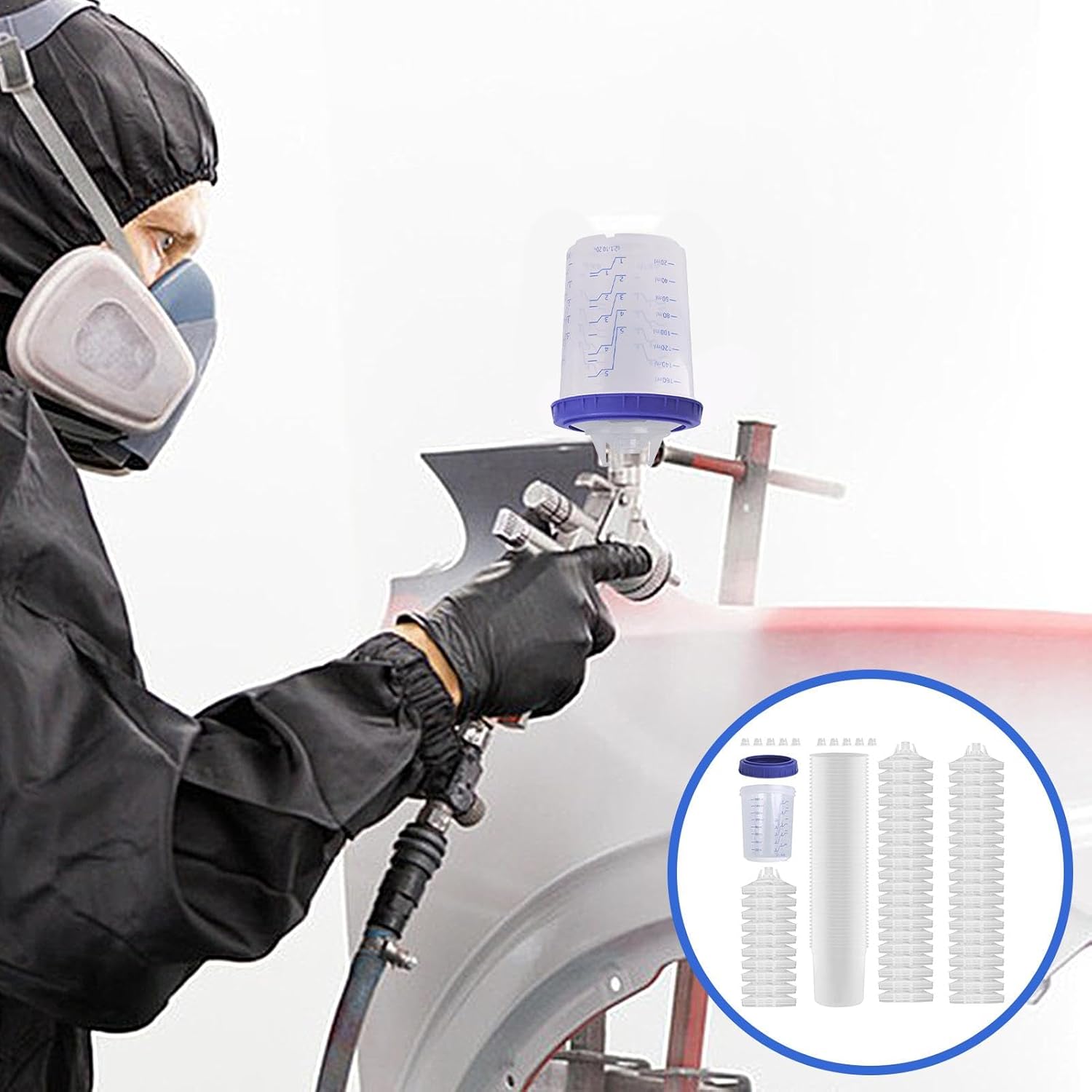 Lot de 50 gobelets à peinture pour peinture de voiture avec échelle transparente | Tasses à mesurer avec couvercles, ensemble pulvérisateur de peinture automobile, bouchons inclus pour pulvérisation de voiture