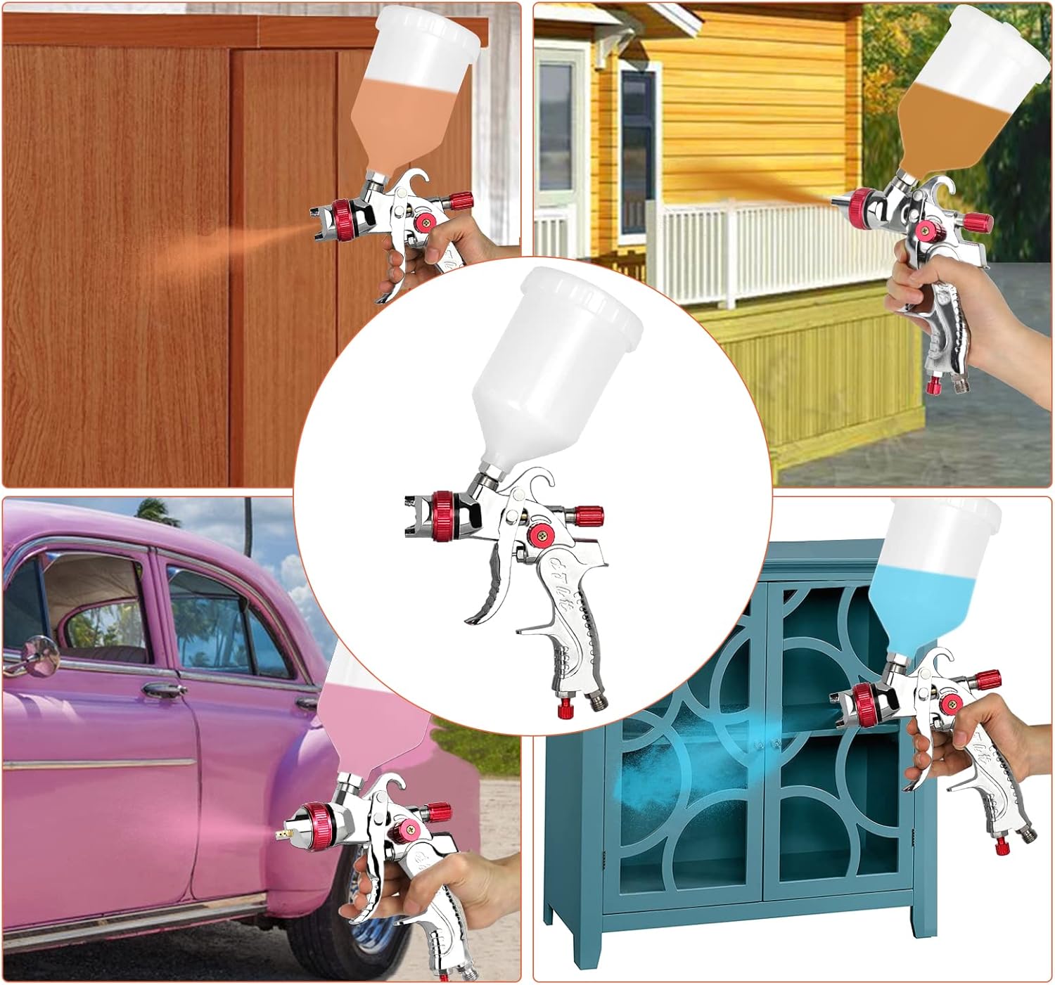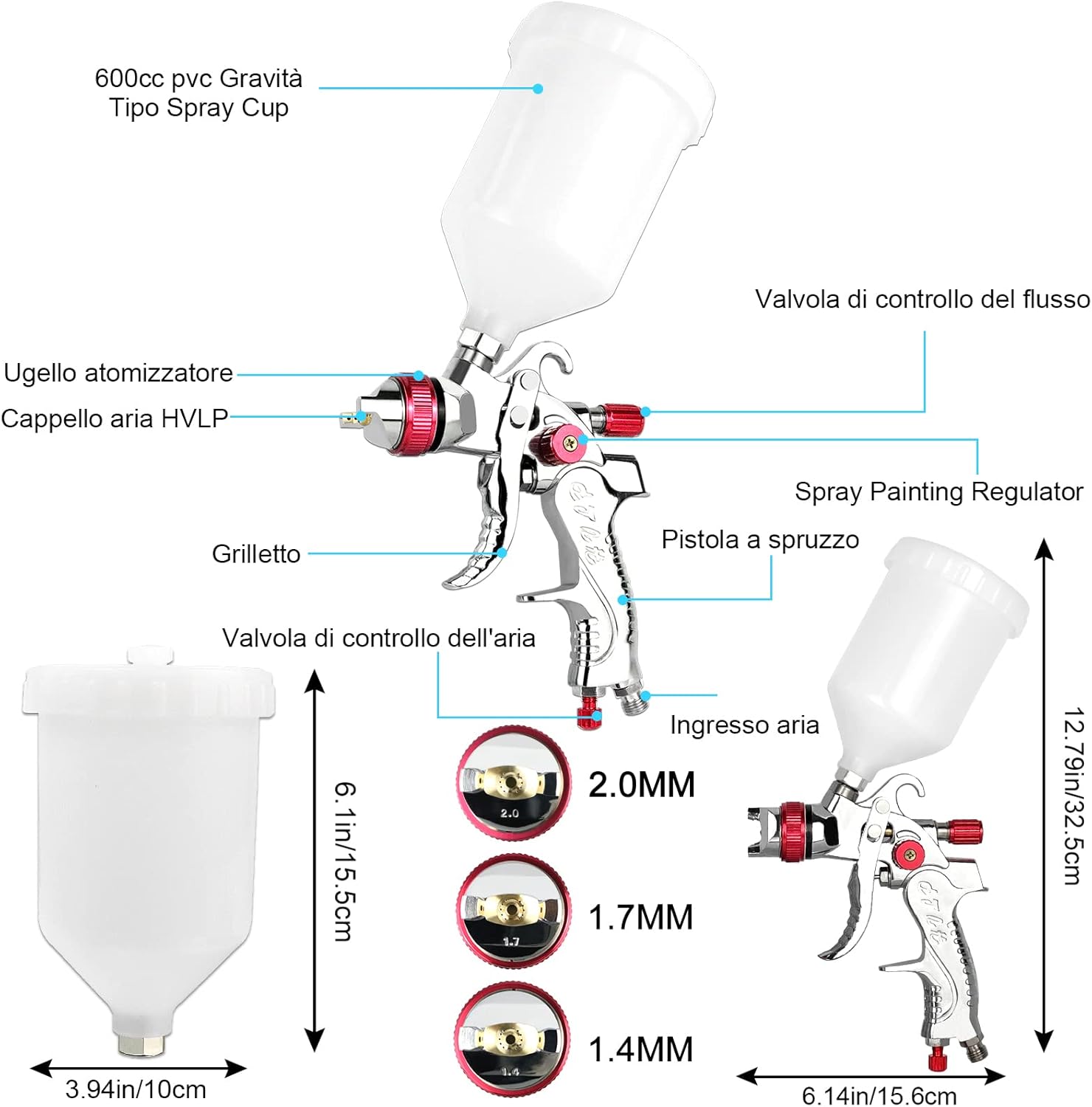 Pistolet de pulvérisation à haute atomisation: le pistolet de pulvérisation HVLP utilise la technologie HVLP et une connexion à l’air comprimé, corps en alliage, avec un réservoir de peinture de 600 ml, 3 buses en acier inoxydable: 1,4 mm, 1,7 mm, 2,0 mm, 1 pistolet de pulvérisation, 1 régulateur d’air avec manomètre, 1 pinceau, 1 clé, pulvérisation fine, économie de temps et de matériaux, obtention d’un effet de pulvérisation homogène et détaillé.
