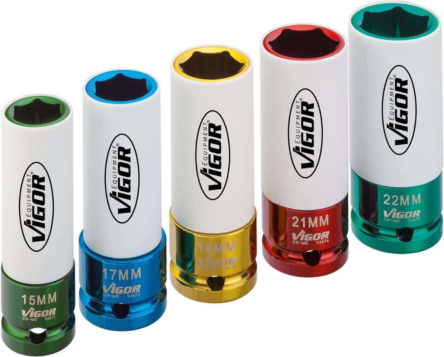 LIVRAISON : 1x ViGOR V2257 Jeu de douilles à choc I 5 pièces, DIN 3121, Clés courantes pour écrous de roues : 15, 17, 19, 21, 22 mmI Dimensions : 198 x 146 x 46 mm, Poids : 1,46 kg’