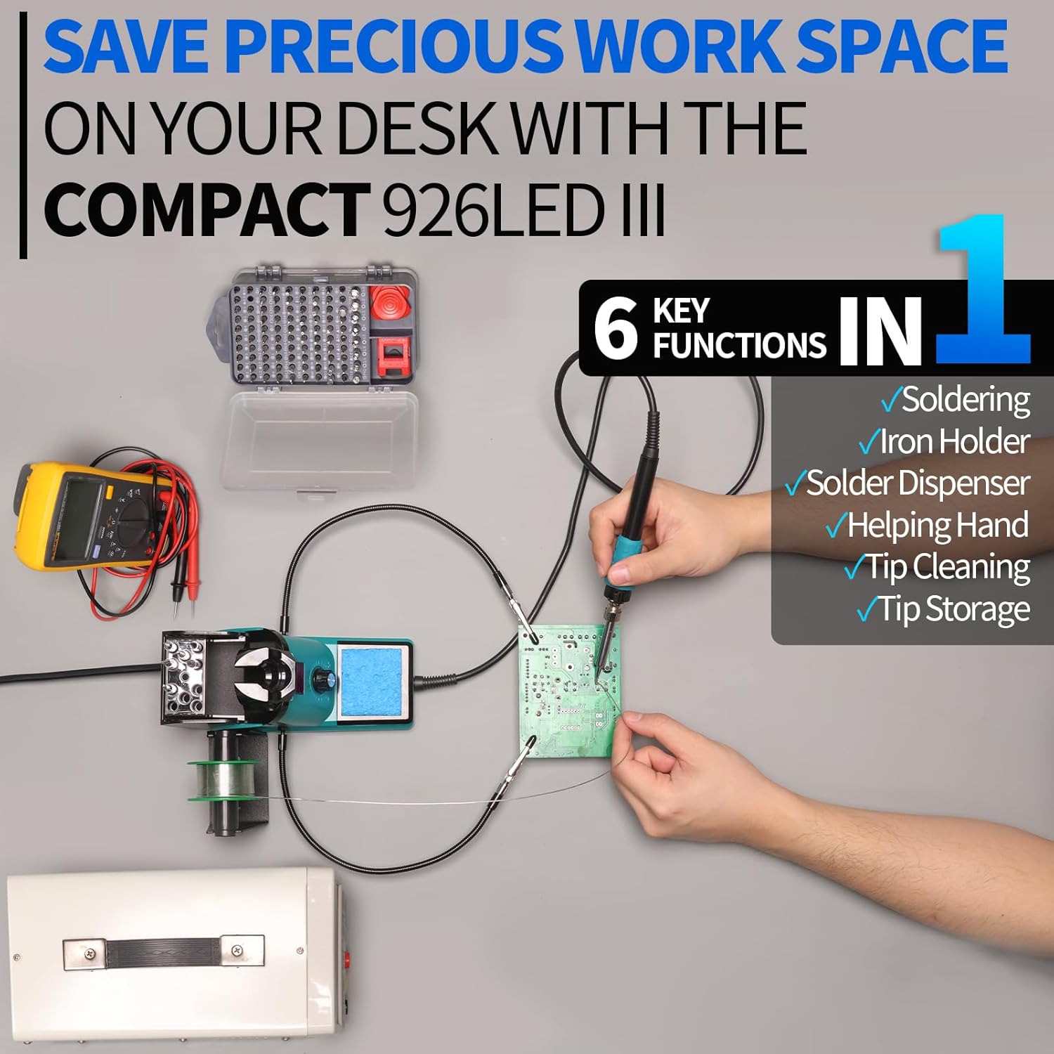 Dans le package – Ce kit de fer à souder comprend la station de soudage YIHUA 926LED III, 2 mains d’aide, 5 embouts de soudage, une bobine de fil de soudure sans plomb, un distributeur de fil de soudure, une éponge de nettoyage.